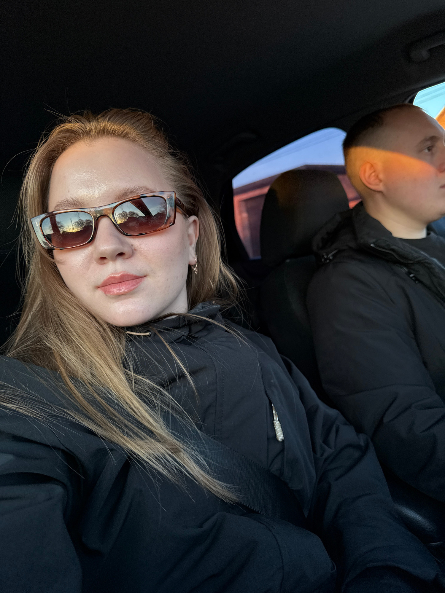 Two individuals are pictured inside what appears to be a car, likely captured during the "golden hour" of either sunrise or sunset, indicated by the warm, directional light. In the foreground, a blonβ¦read more