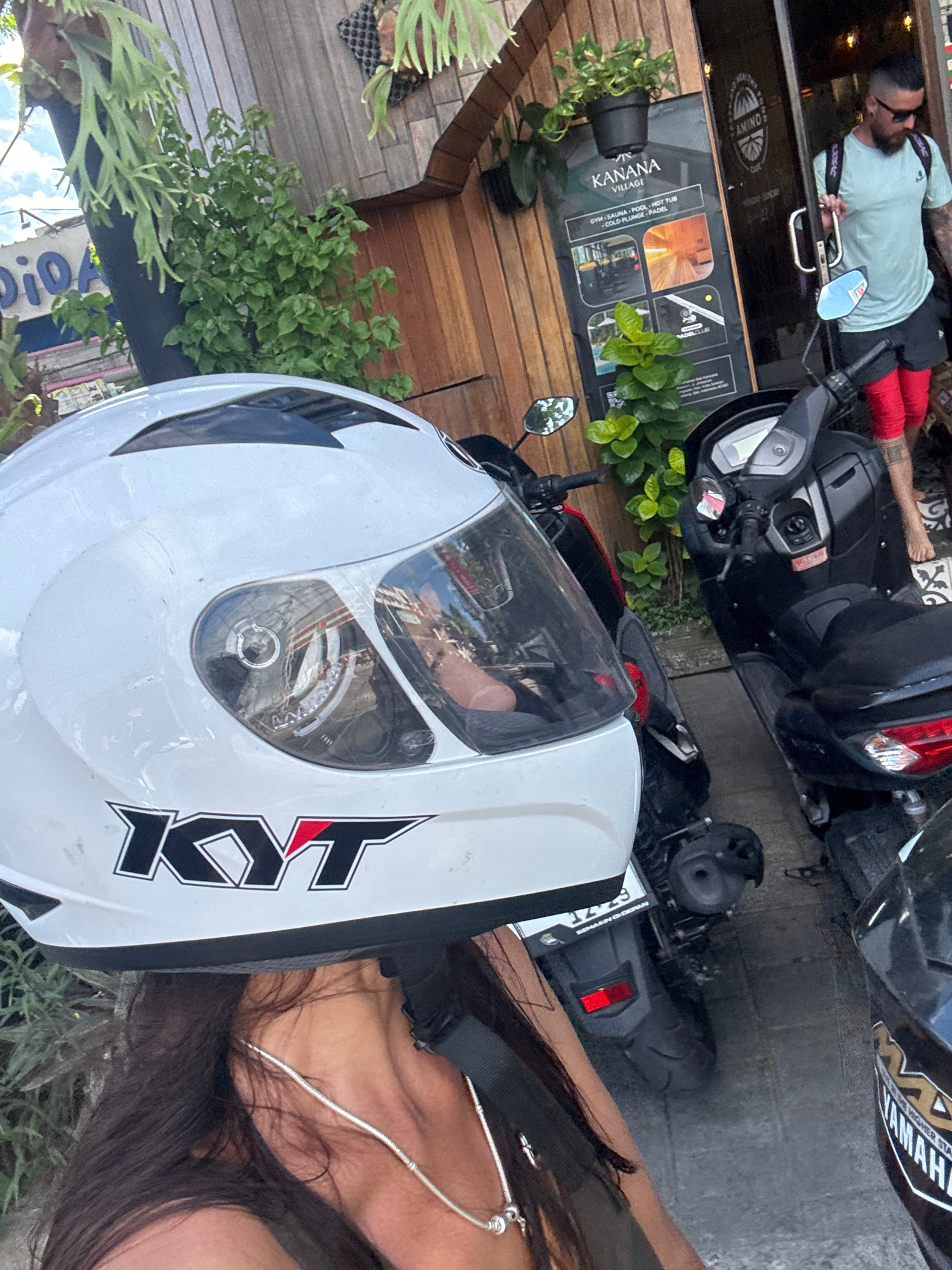 The image captures a scene in Ungasan, Indonesia, featuring a white KYT motorcycle helmet as the prominent subject. A portion of a woman with long, dark hair and a silver necklace is visible. A motorc…read more