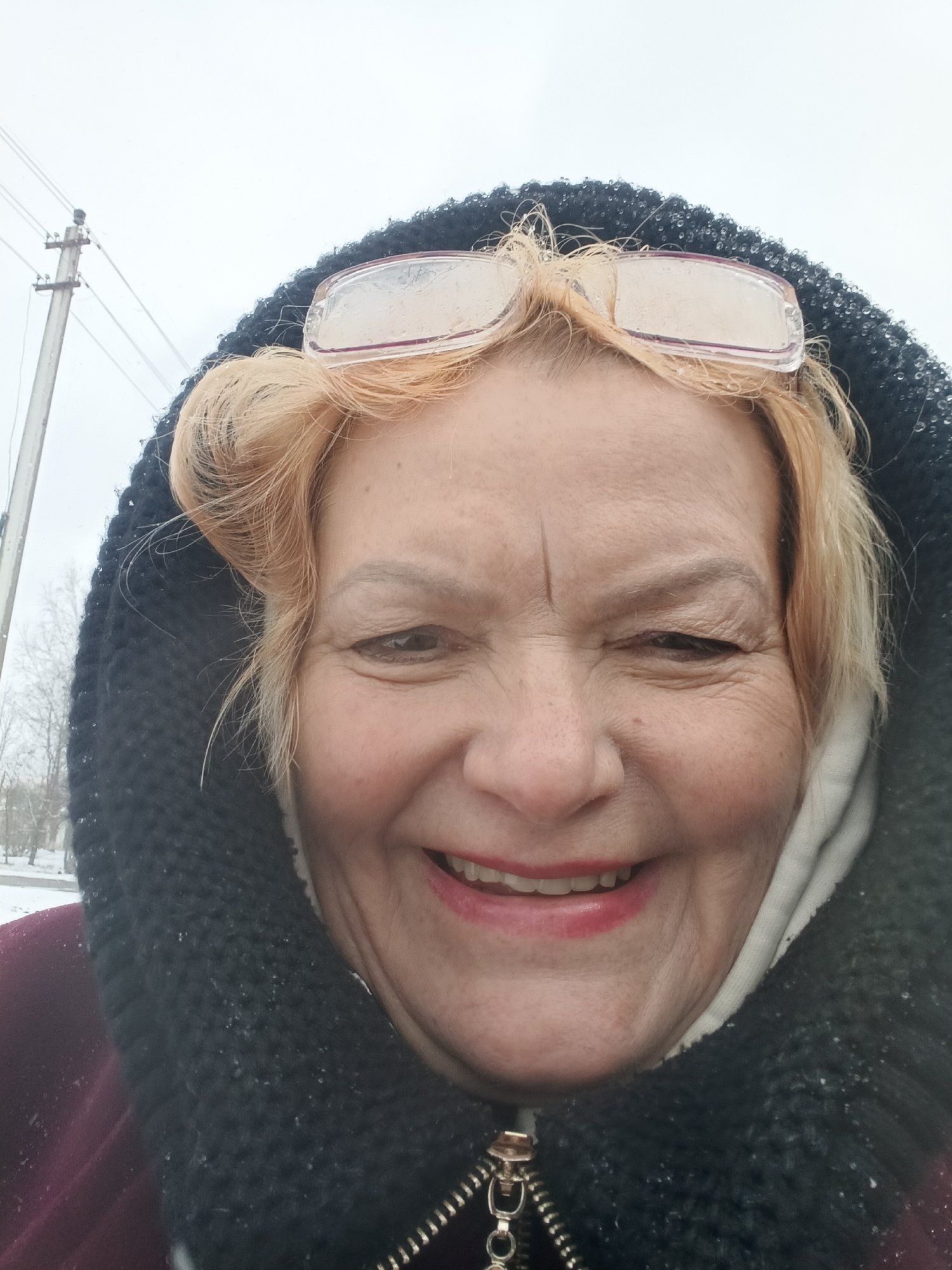 A close-up outdoor selfie captures an older woman with blonde or light red hair, fair skin, and a broad, joyful smile. Her eyes are crinkled at the corners, reflecting her happy expression. She is wea…read more