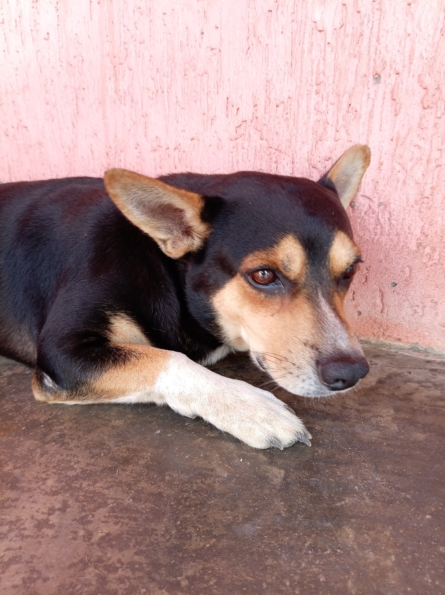 A medium-sized dog lies on a brown surface, its head and forepaws resting towards the lower right of the frame. The dog has short, dark brown fur with tan markings around its face and ears. Its left f…read more