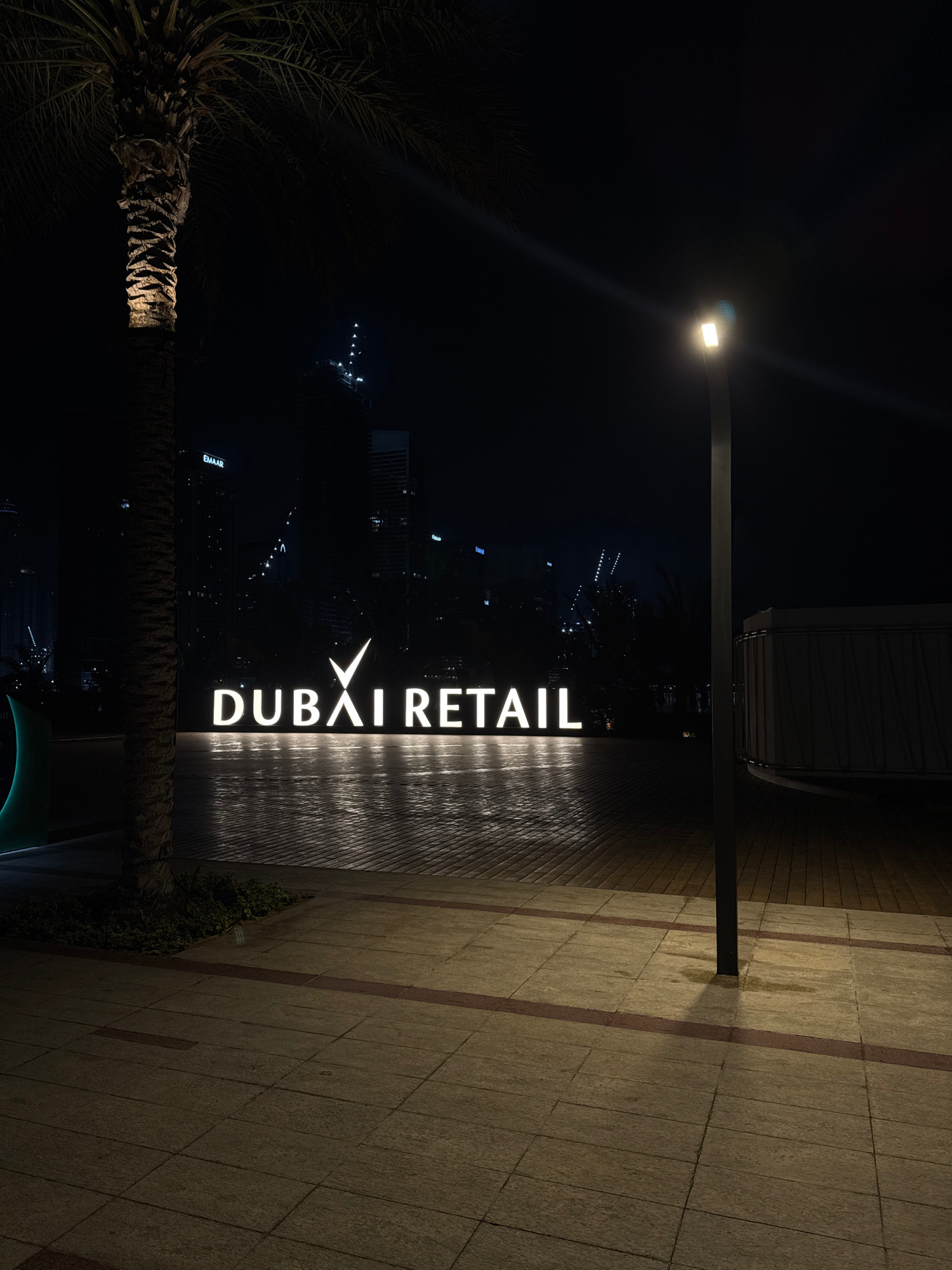 At night, the "DUBAI RETAIL" sign is prominently displayed, lit up against the backdrop of the Dubai skyline. A streetlamp casts light on the scene. The sign is positioned next to a sidewalk paved wit…read more
