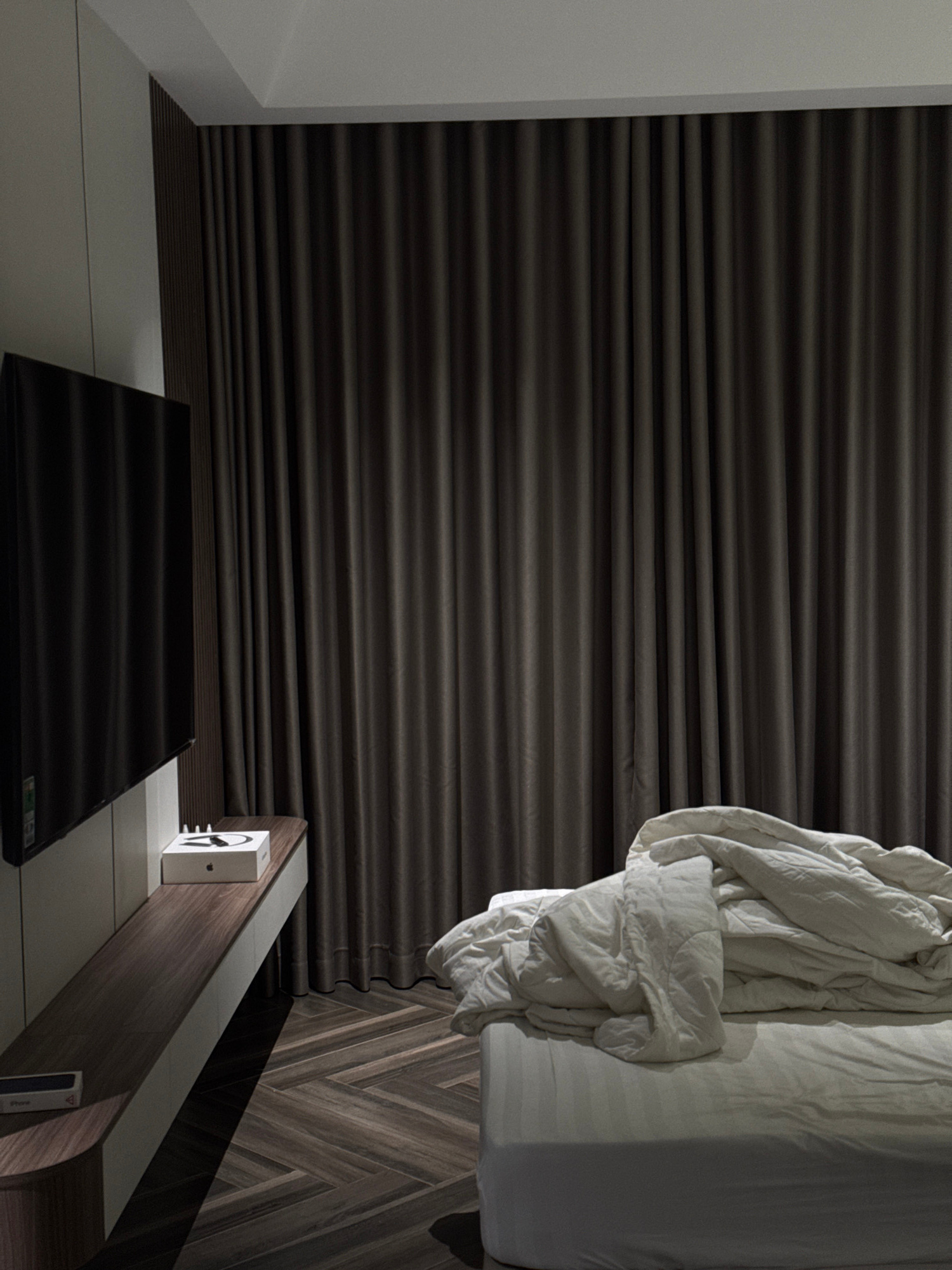 The image depicts an interior scene. The dominant feature is a bed, which is partially visible, with white bedding and a crumpled white duvet. Adjacent to the bed is a wooden headboard or side table w…read more