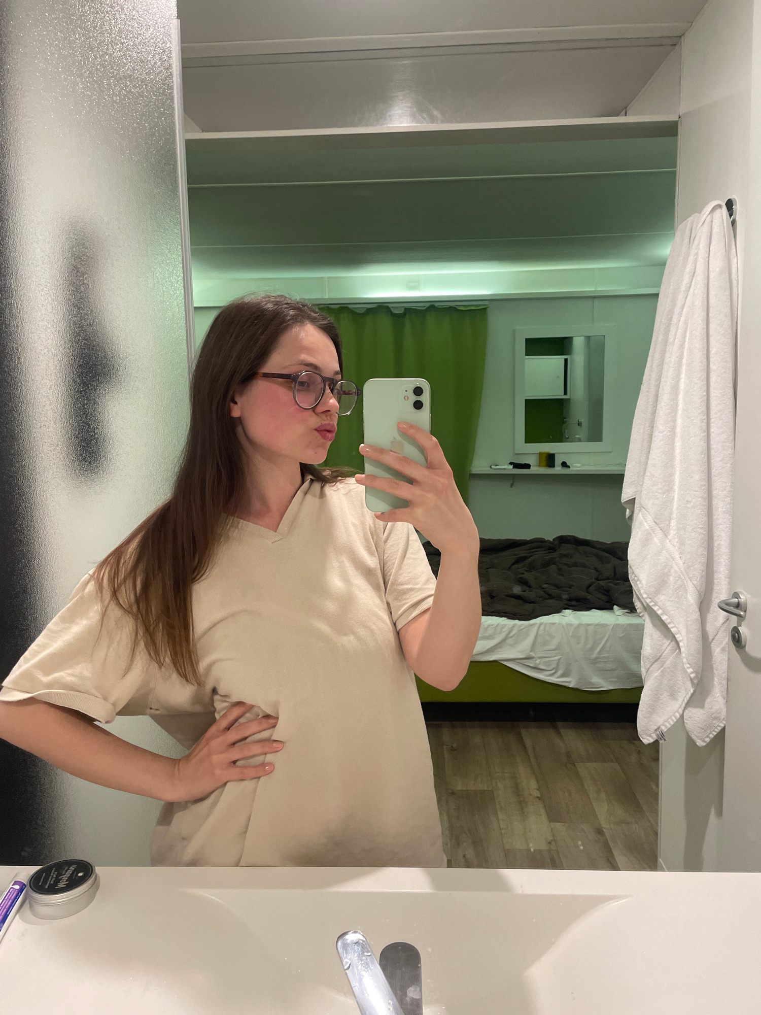 A person with long brown hair, wearing glasses and a tan T-shirt, is taking a selfie in a bathroom. The bathroom has a white towel hanging above, a mirror, and a small window reflecting what appears t…read more