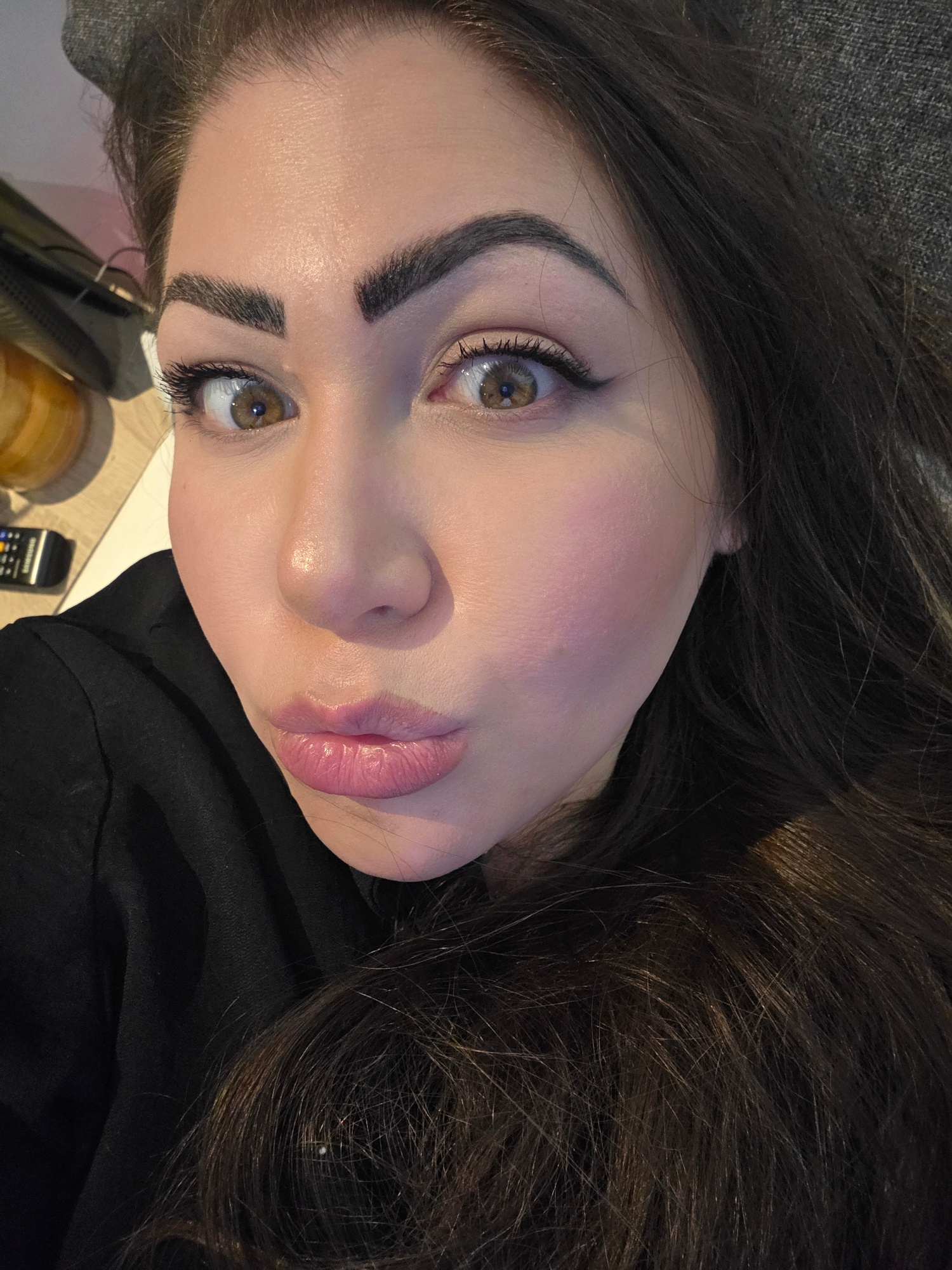 A close-up, angled portrait depicts a young woman with fair skin, prominent cheekbones, and full lips wearing pink lipstick. She has thick, dark eyebrows and hazel eyes with dark eyeliner and mascara.…read more