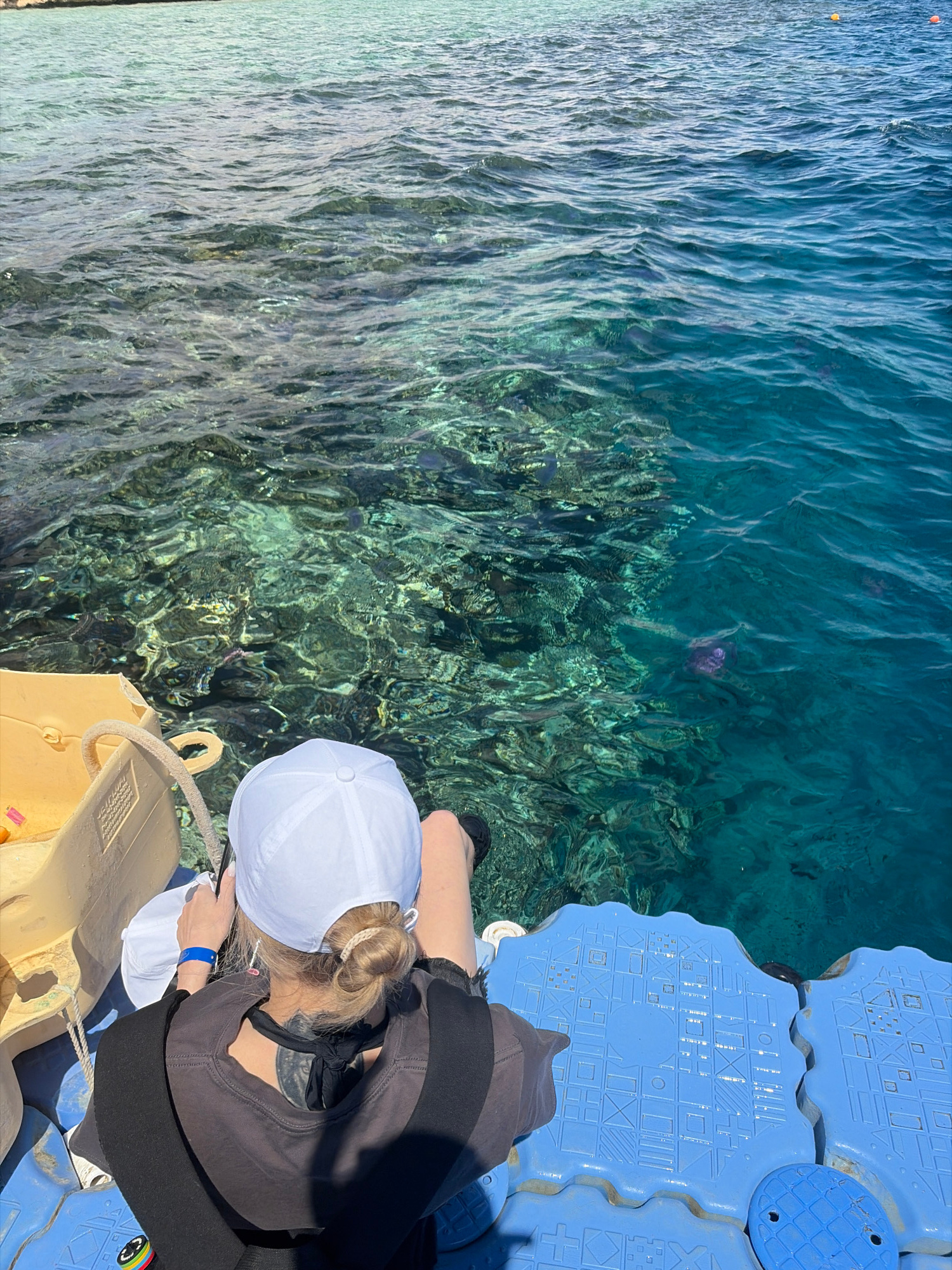 An individual is depicted from an overhead rear perspective, seated on a blue modular floating platform in the clear waters of Sharm El Sheikh, Egypt. The person wears a white baseball cap, a dark-col…read more