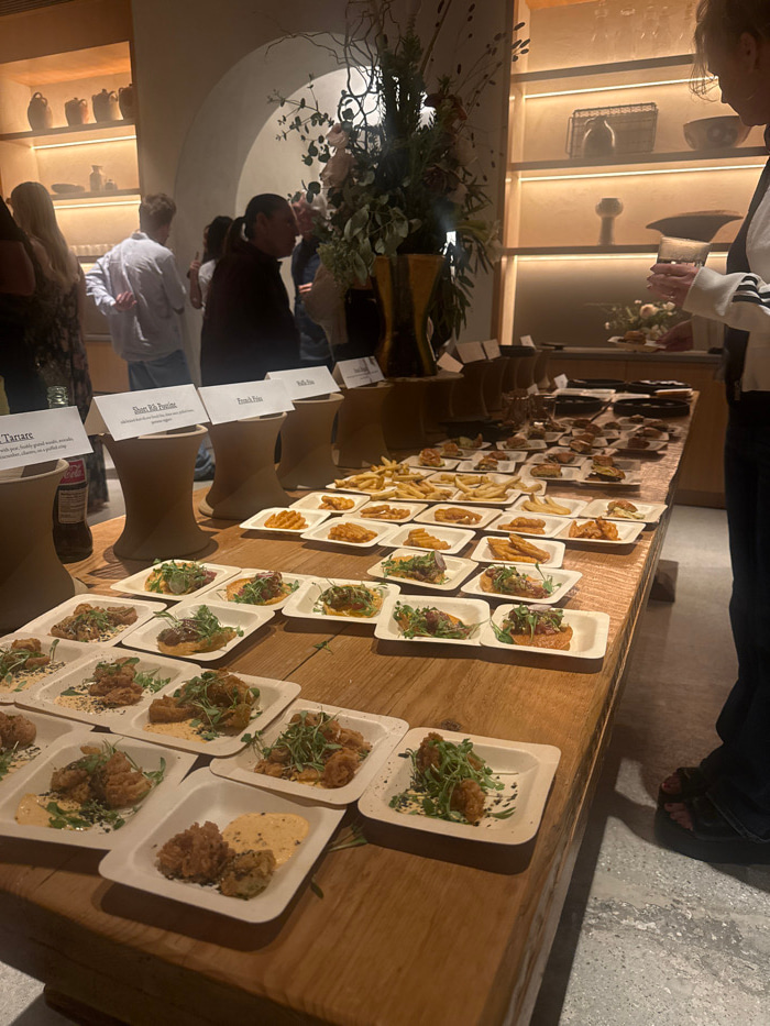 The image displays an indoor food event or tasting taking place in Los Angeles, United States of America. A long, rustic wooden table, extending from the lower left to the upper right of the frame, is…read more