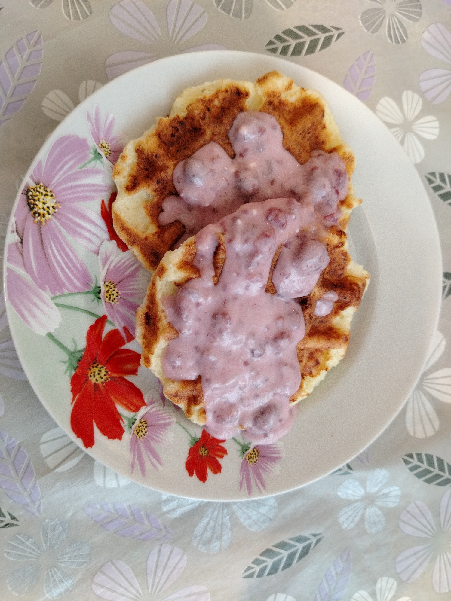 A top-down, full shot shows two irregularly shaped pancakes, stacked, on a white plate decorated with red and purple flowers. The pancakes are covered in a pink, creamy sauce that contains small piece…read more