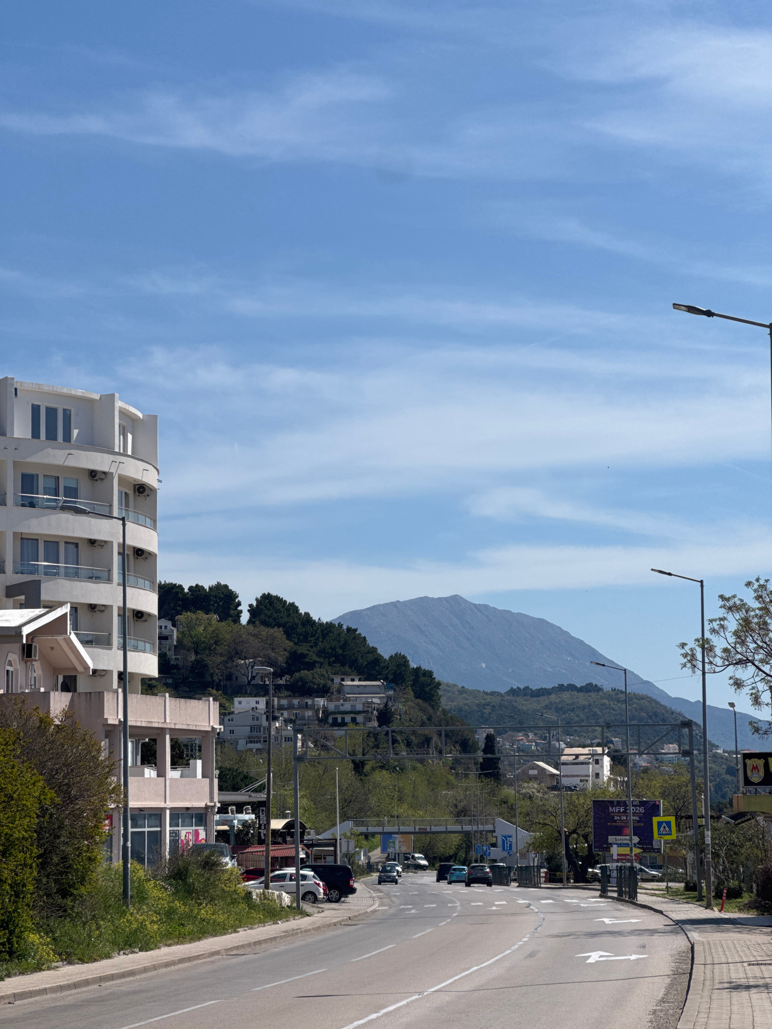 The image depicts a view in Sutomore, Montenegro, showcasing a street scene with a modern white building in the foreground. The building has multiple balconies and air conditioning units on its facade…read more