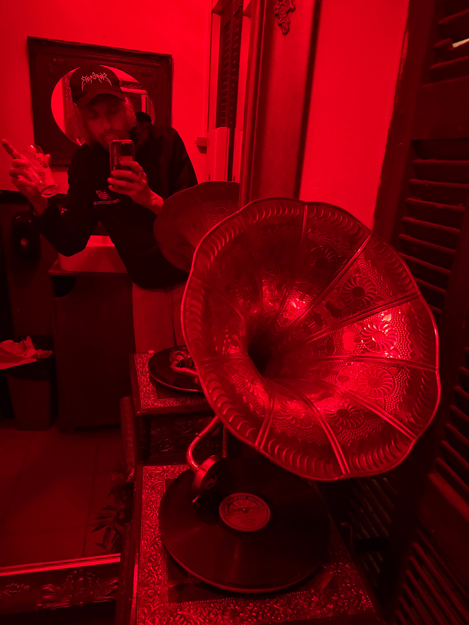 A red-lit room features a vintage gramophone with a large, ornate horn and a vinyl record. A person is visible in a mirror, wearing a baseball cap and holding a mobile phone. The location is possibly…read more