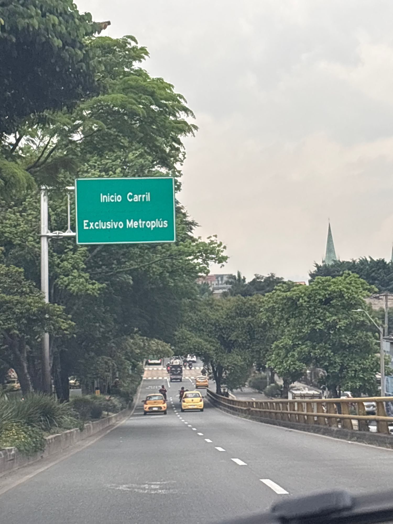 The image shows a green road sign reading "Inicio Carril Exclusivo Metroplús" indicating the start of an exclusive Metroplús lane. The sign is located on a highway in Medellín, Colombia, as evidenced…read more