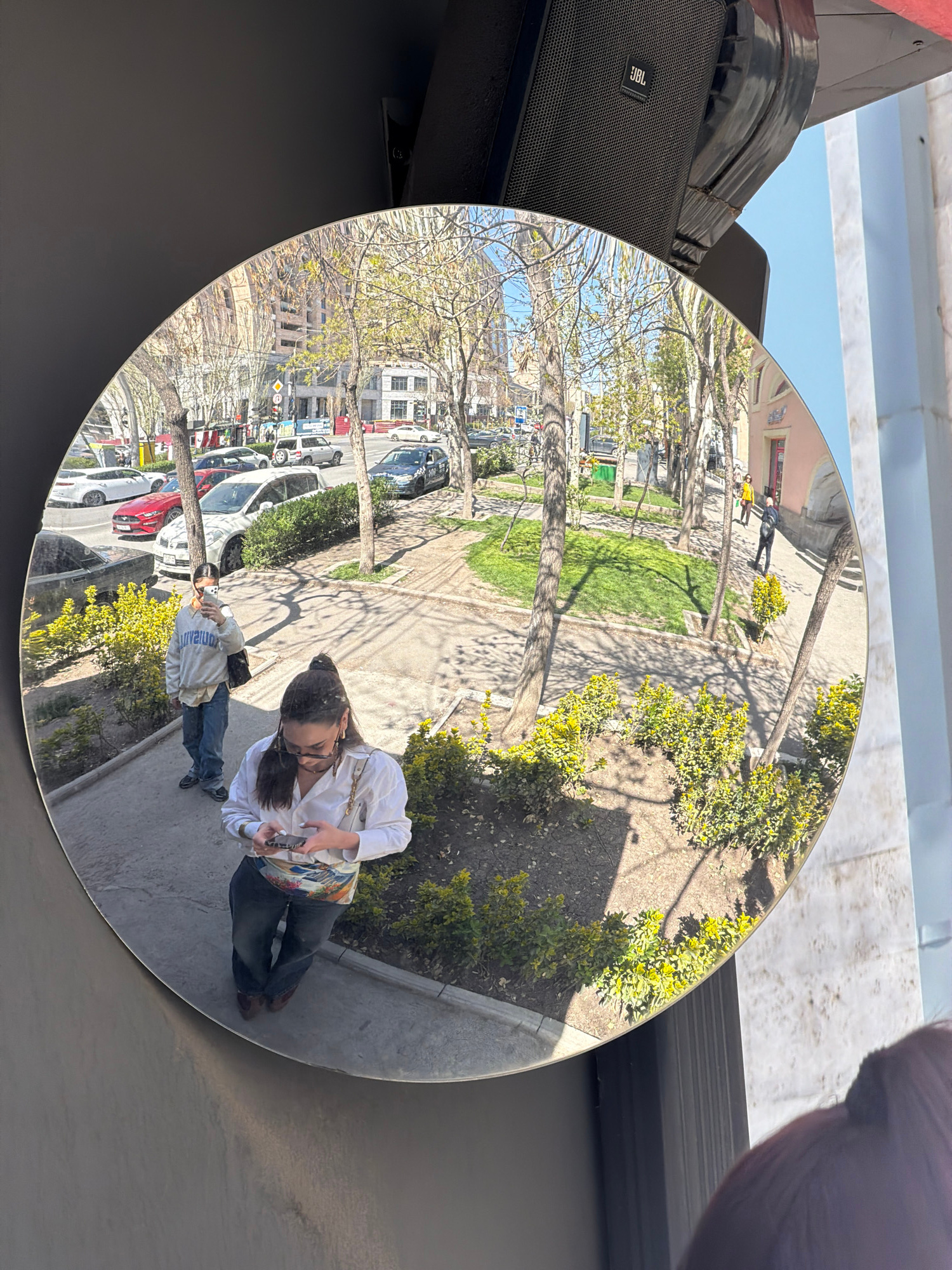 The image displays a circular mirror reflecting an outdoor urban scene, captured from an elevated perspective. The mirror rests on a flat, dark gray surface. To the left, a black JBL speaker is partia…read more