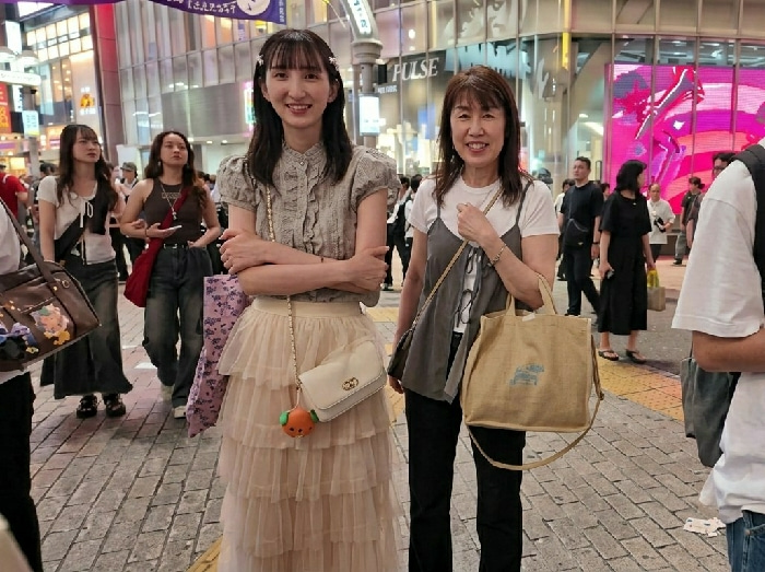 Two East Asian women stand in the foreground of a bustling street in Shibuya, Japan, smiling towards the camera. The younger woman on the left has long dark hair with bangs and small hair clips; she w…read more