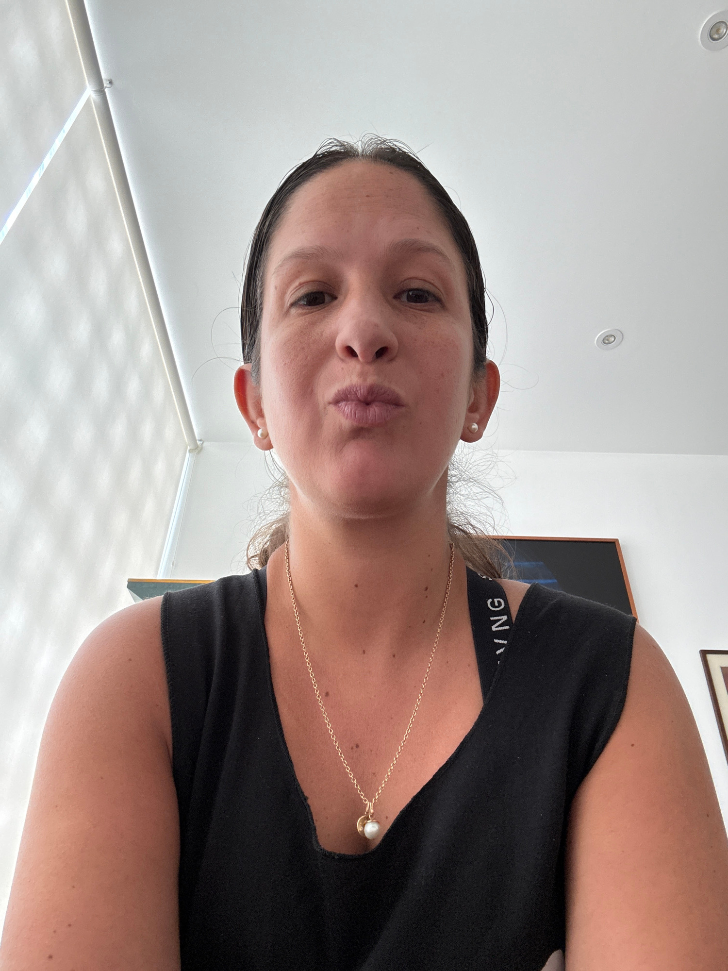 A woman is centered, head turned towards the camera, inside a room with white walls. She is wearing a black tank top, with visible black underclothing. She has a gold chain necklace with a pearl. The…read more