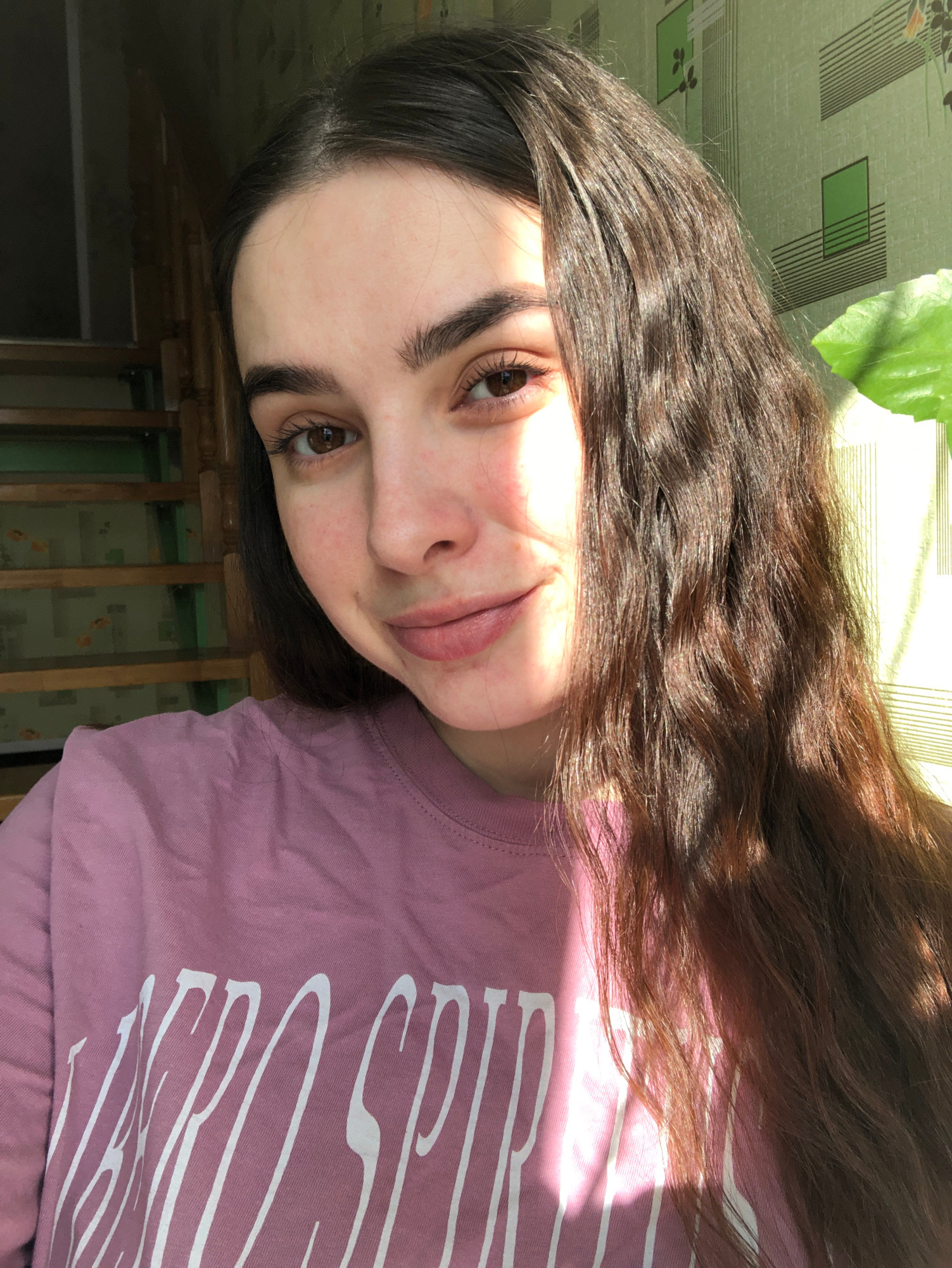 A young woman with long, dark brown wavy hair is posing indoors. She is fair-skinned with dark eyes and thick eyebrows. She's wearing a mauve or light purple t-shirt with white lettering partially vis…read more