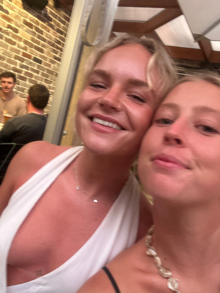 The image displays two young women positioned closely in the foreground, with two men seated in the background. The woman on the left, prominent in the frame, has blonde hair, a nose piercing, and isβ¦read more