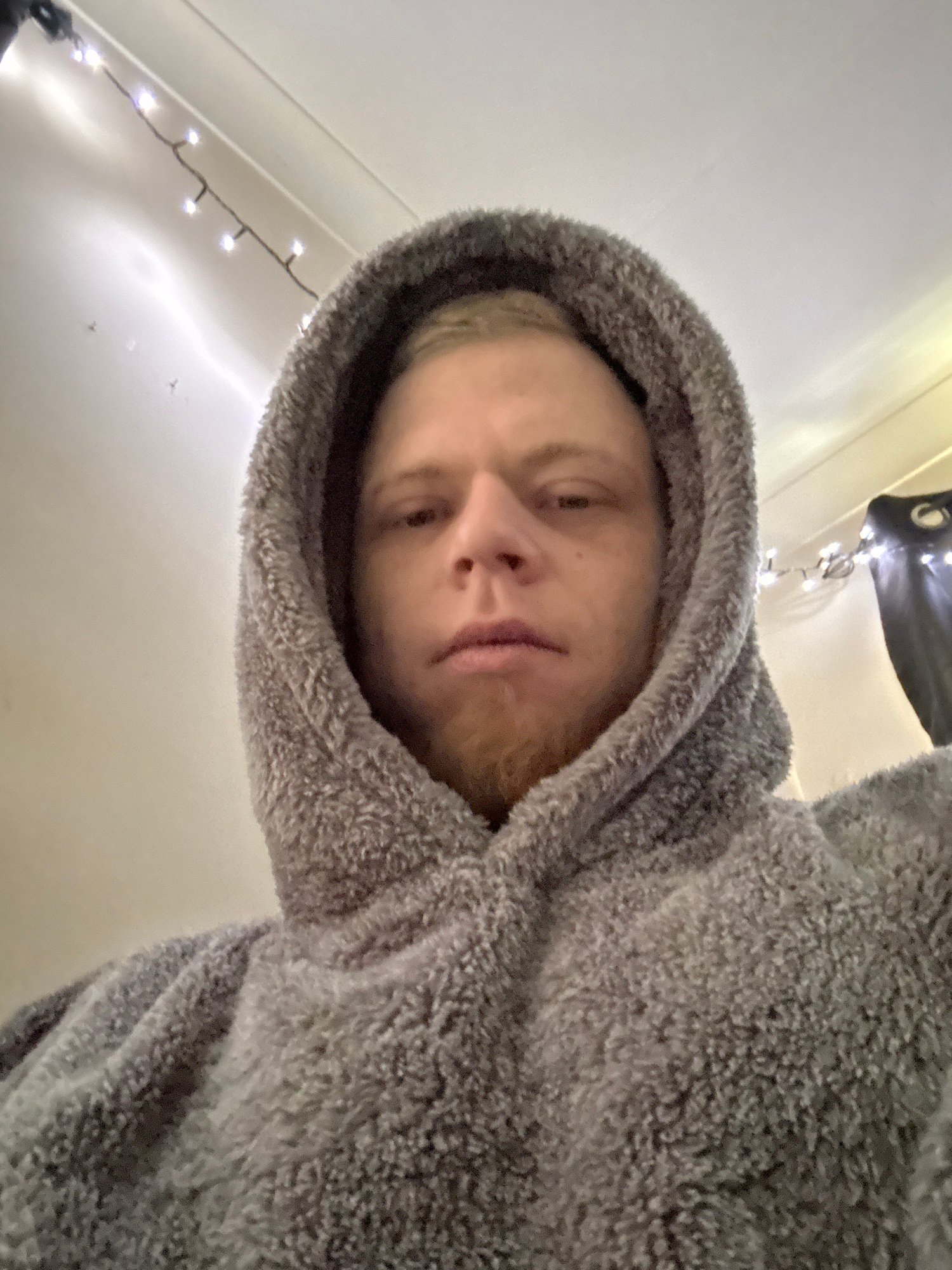 A selfie shows a person with fair skin and blonde hair, partially covered by a large, gray, fuzzy hooded garment. The person's face is angled slightly downward, with the nose centered in the frame. Be…read more