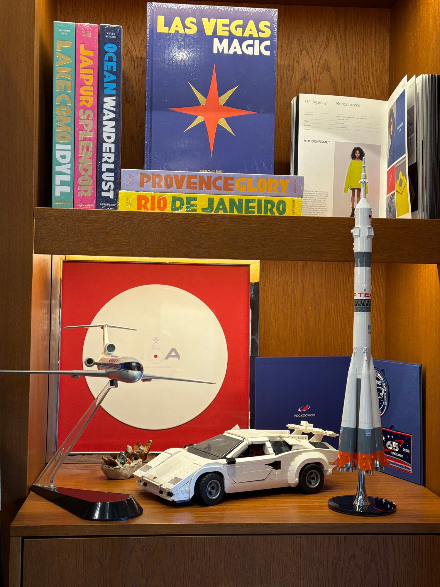 The image captures a wooden bookshelf or display unit in Moscow, Russia, showcasing a curated collection of books and models. On the top shelf, an open book titled "Monochrome" by "F61 Agency" featur…read more