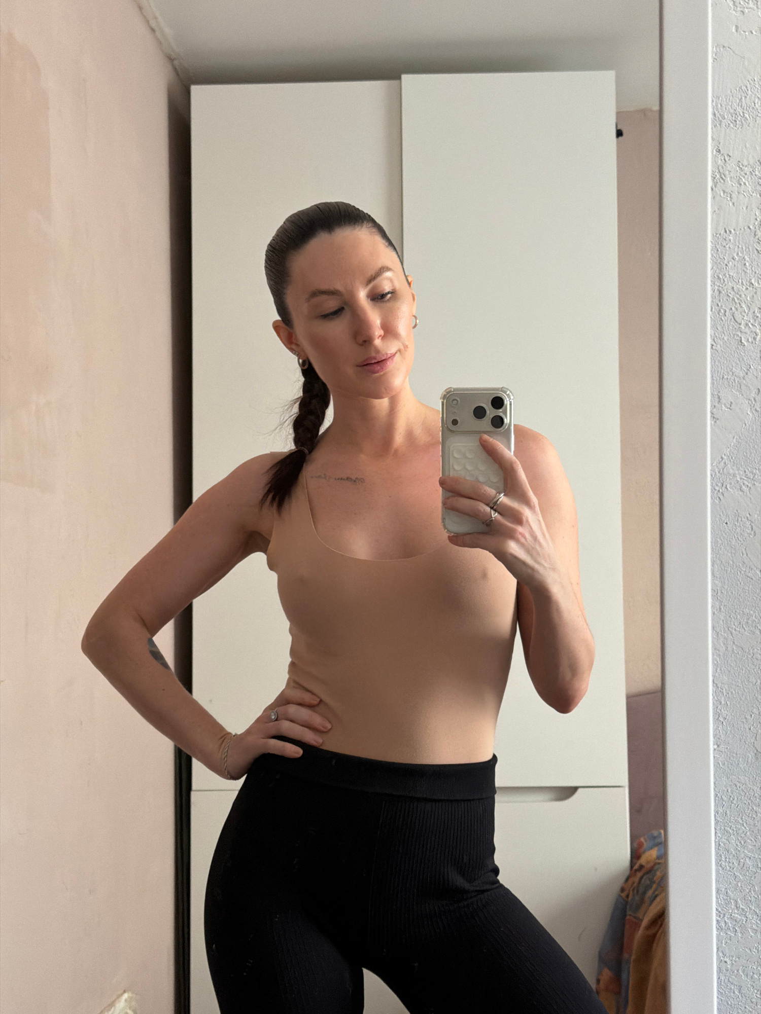 A woman is taking a selfie in what appears to be an indoor setting. She is wearing a tan-colored top and black leggings. The background includes a light-colored wall with a cabinet or drawers, and a l…read more
