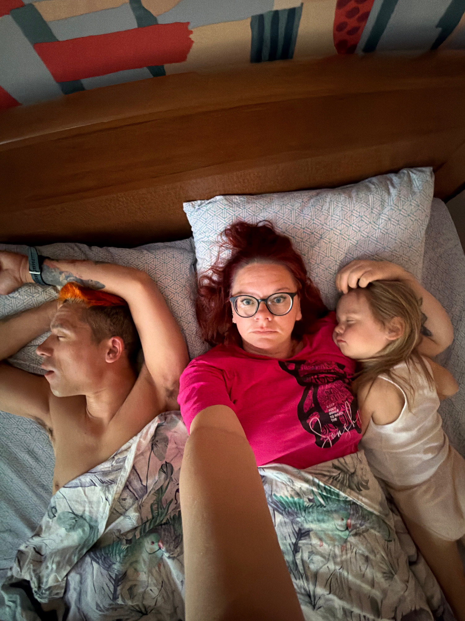 The image shows three individuals resting together in a bed, viewed from an overhead perspective. An adult woman with red hair and black-rimmed glasses lies awake on a pillow, looking directly at the camera with a neutral expression. She is wearing a bright pink t-shirt that displays partially visible black text, including "THE PINK PANTHERS WILL" and other smaller words. Resting on her upper body is a young child with blonde hair, fast asleep in a white top. Below the red-haired woman, another adult with short, orange-dyed hair is visible, lying on their back, also appearing to be asleep or resting. This individual is bare-chested and has a dark watch on their left wrist, along with visible tattoos on their arm. One of their arms is gently draped over the red-haired woman's shoulder. The bed features light-colored pillows with a subtle geometric pattern. A duvet covers the lower half of the people, displaying a distinctive light green and blue tropical leaf and bird pattern. A wooden headboard or bed frame is visible along the left side of the image, and further left, a patterned curtain or wall hanging with blocks of red, teal, and beige colors can be seen. The scene conveys a moment of familial intimacy and rest, likely indoors during the daytime in a bedroom in Chaikovsky, Russia. | Open Wire