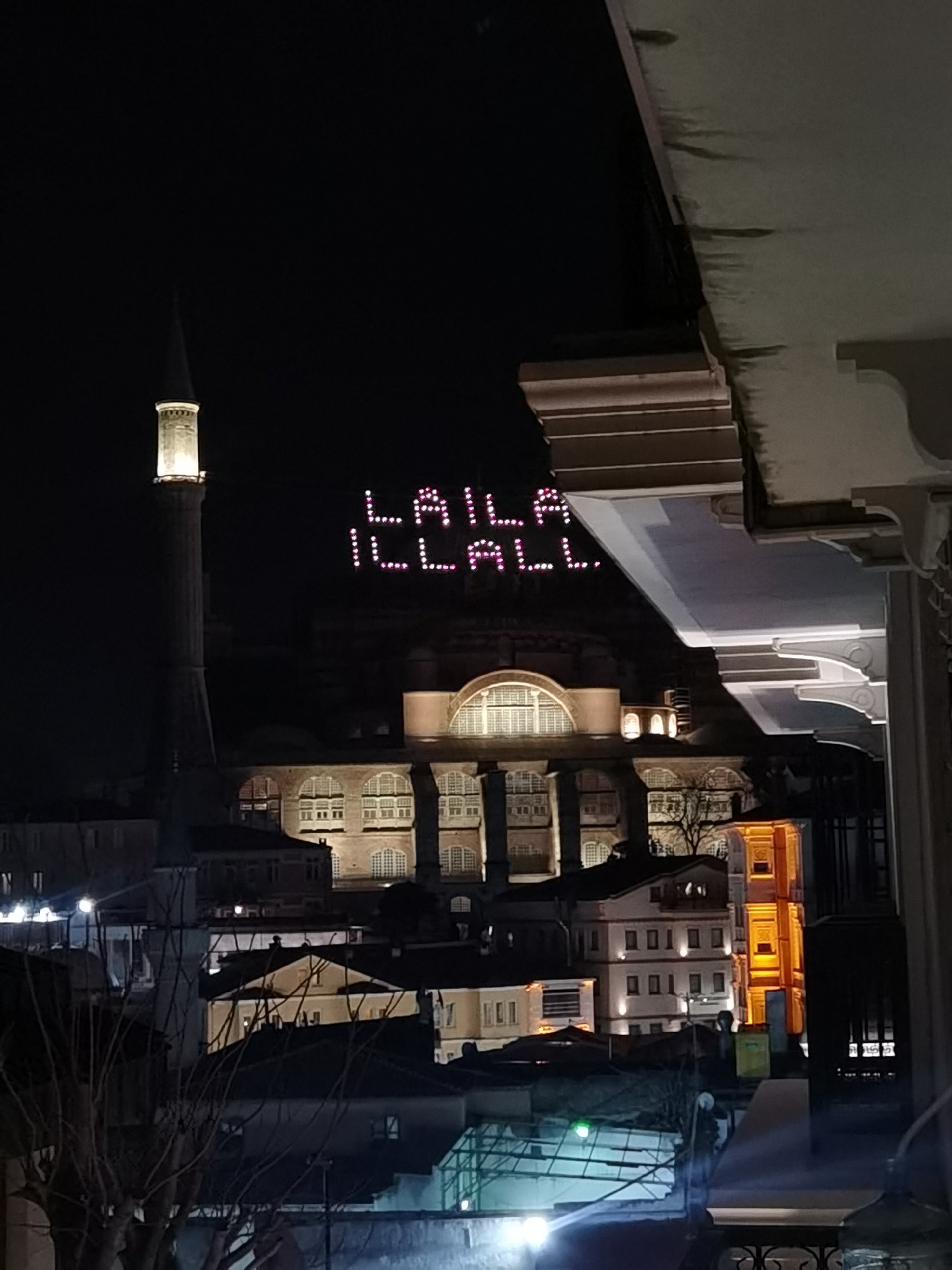 Night view of Istanbul, Turkey, showcasing the Hagia Sophia and a minaret against the night sky. Above the Hagia Sophia, illuminated pink lights spell out "LAILA ILLA ALL." The foreground reveals roof…read more