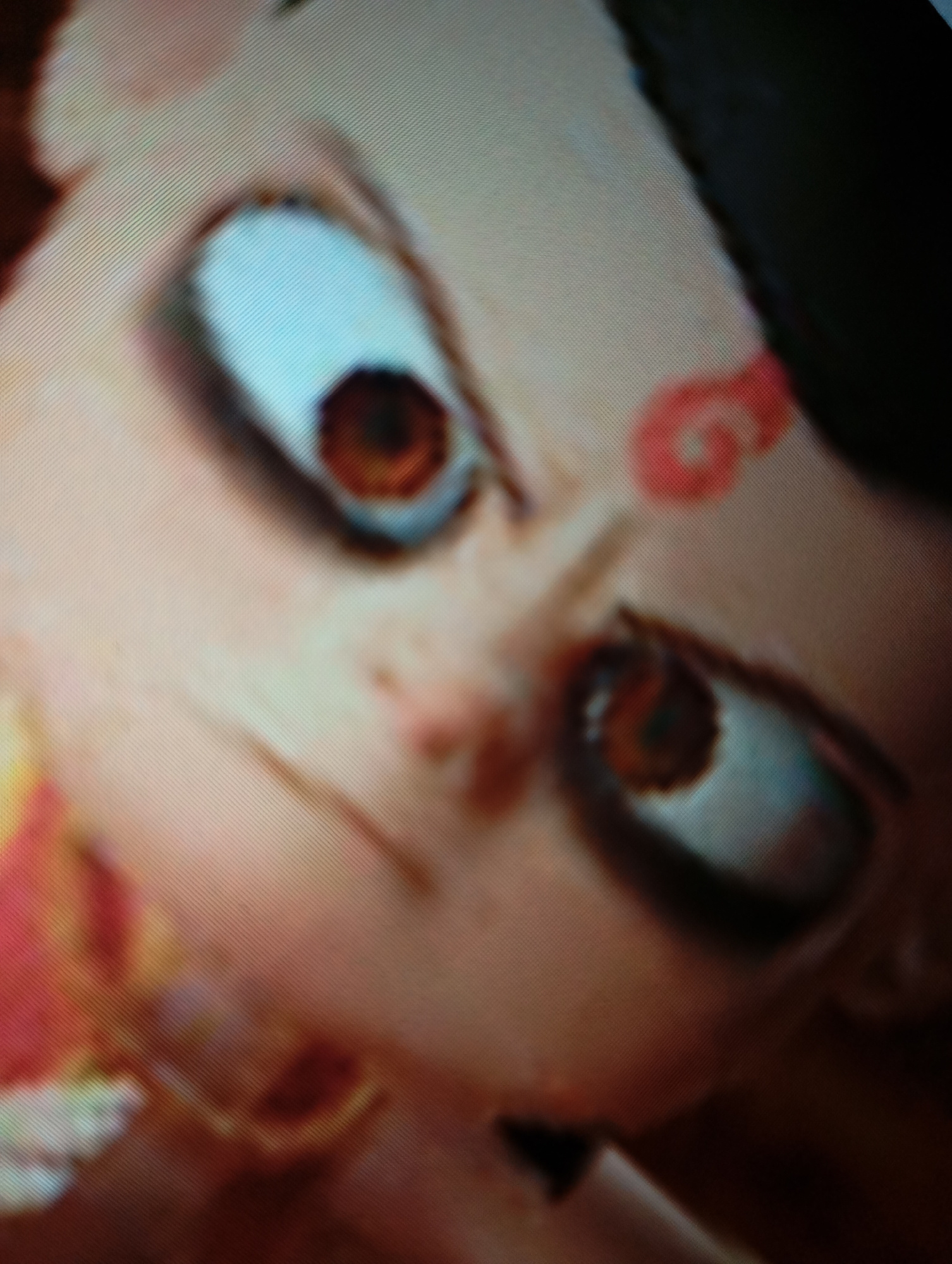 A close-up, angled portrait of a cartoon character with light skin, wide light blue eyes with dark brown irises, and thick dark eyeliner. The character has a stern expression with a furrowed brow and…read more