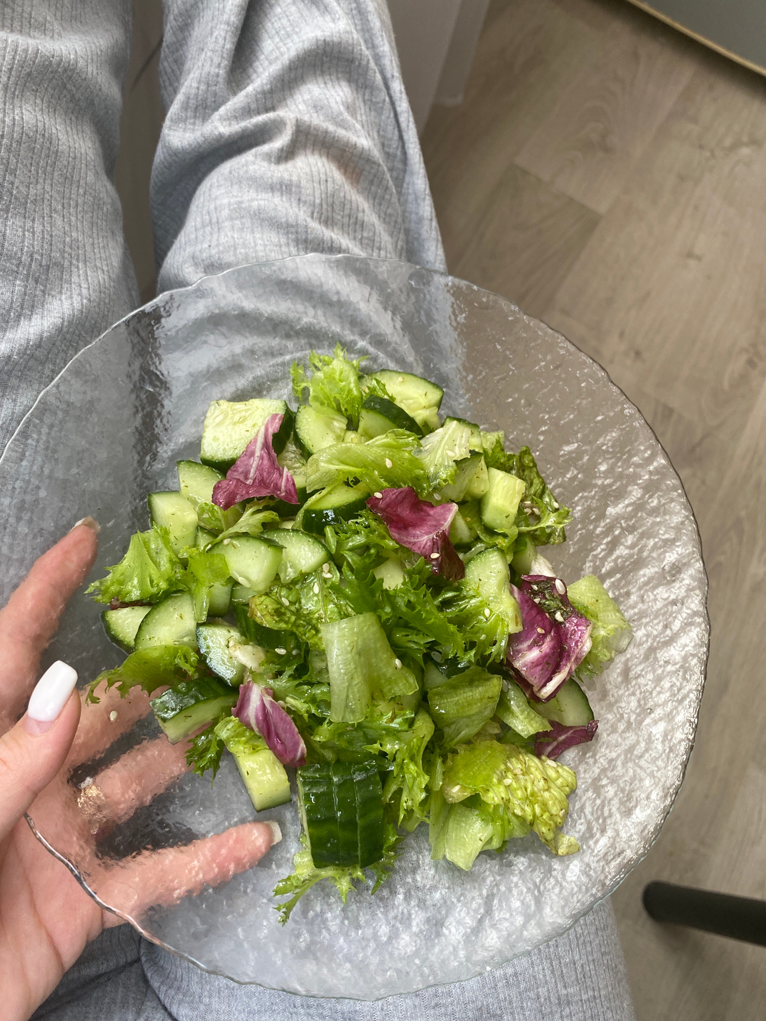 A person wearing gray sweatpants is holding a clear, textured glass plate of salad. The salad contains lettuce, cucumber, and red cabbage. The location is Chaikovsky, Russia. The plate is supported by…read more