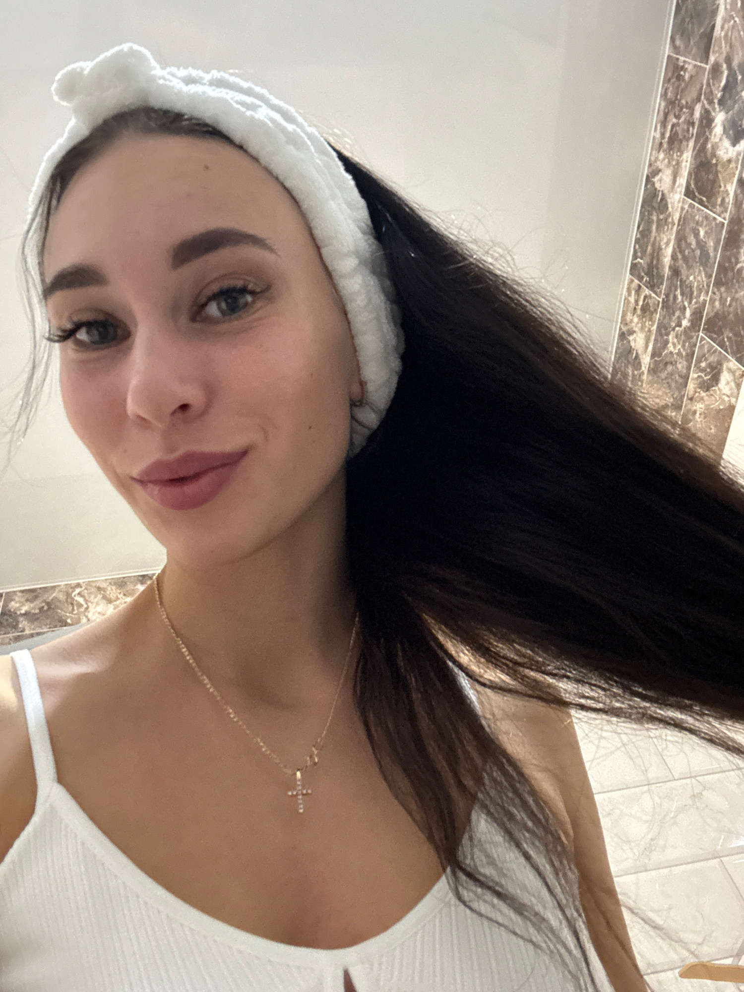 A young woman with dark hair is taking a selfie in what appears to be a bathroom. She is wearing a white headband and a white tank top, and a gold necklace with a cross pendant is visible. The backgro…read more