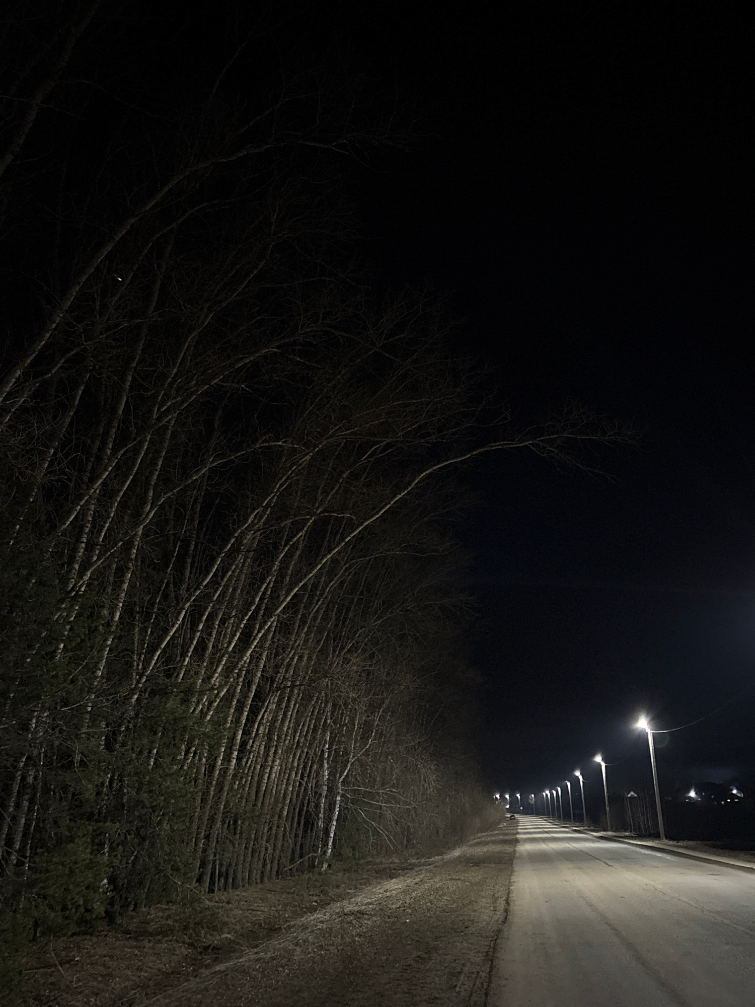 The image shows a dark, outdoor scene taken at night. On the right side is a high concrete wall with a row of lights running along the top of it. The lights are emitting a soft glow. Below the wall an…read more