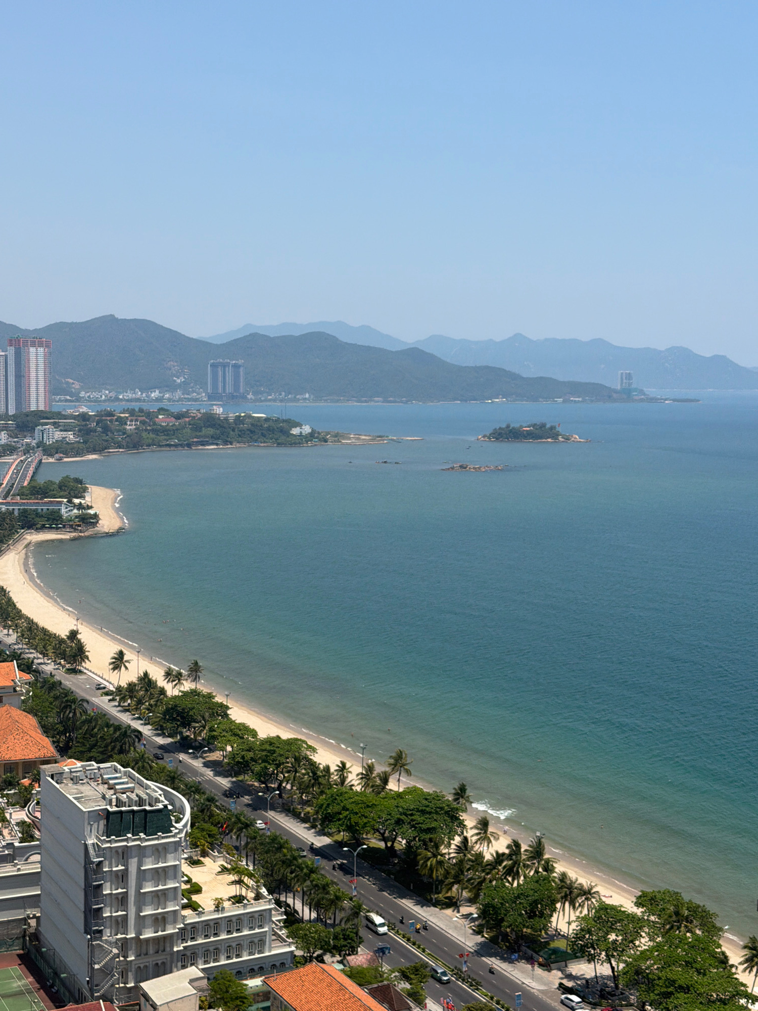 This aerial view depicts a portion of the coastline of Nha Trang, Vietnam. The image, taken from a high vantage point, captures a beach with a sandy shoreline fringed by palm trees. A road runs parall…read more