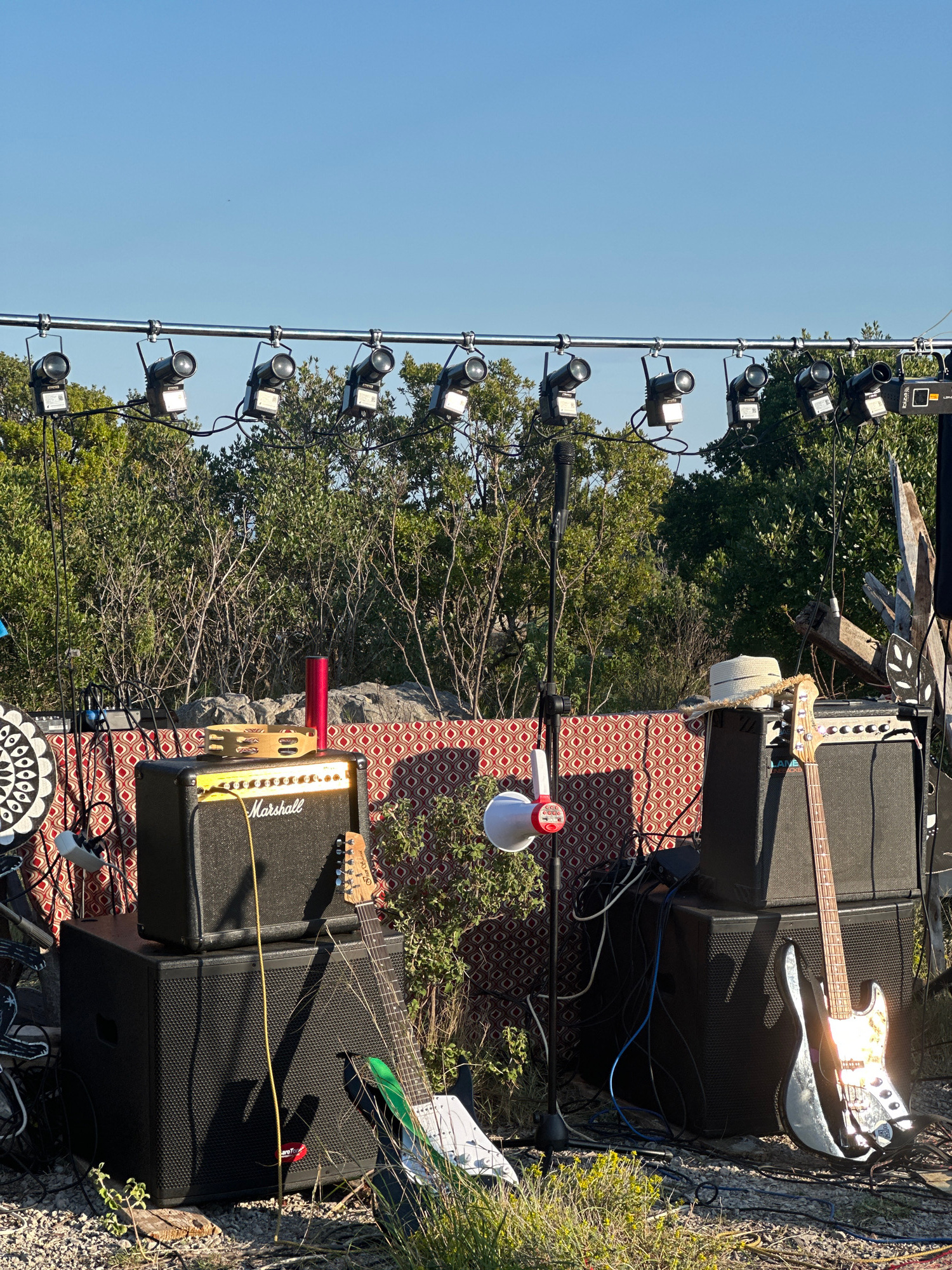 The image shows a stage setup outdoors in Radovići, Montenegro. Visible are stage lights mounted on a vertical pole, two guitar amplifier stacks, a microphone stand, and a red and white megaphone. Two…read more
