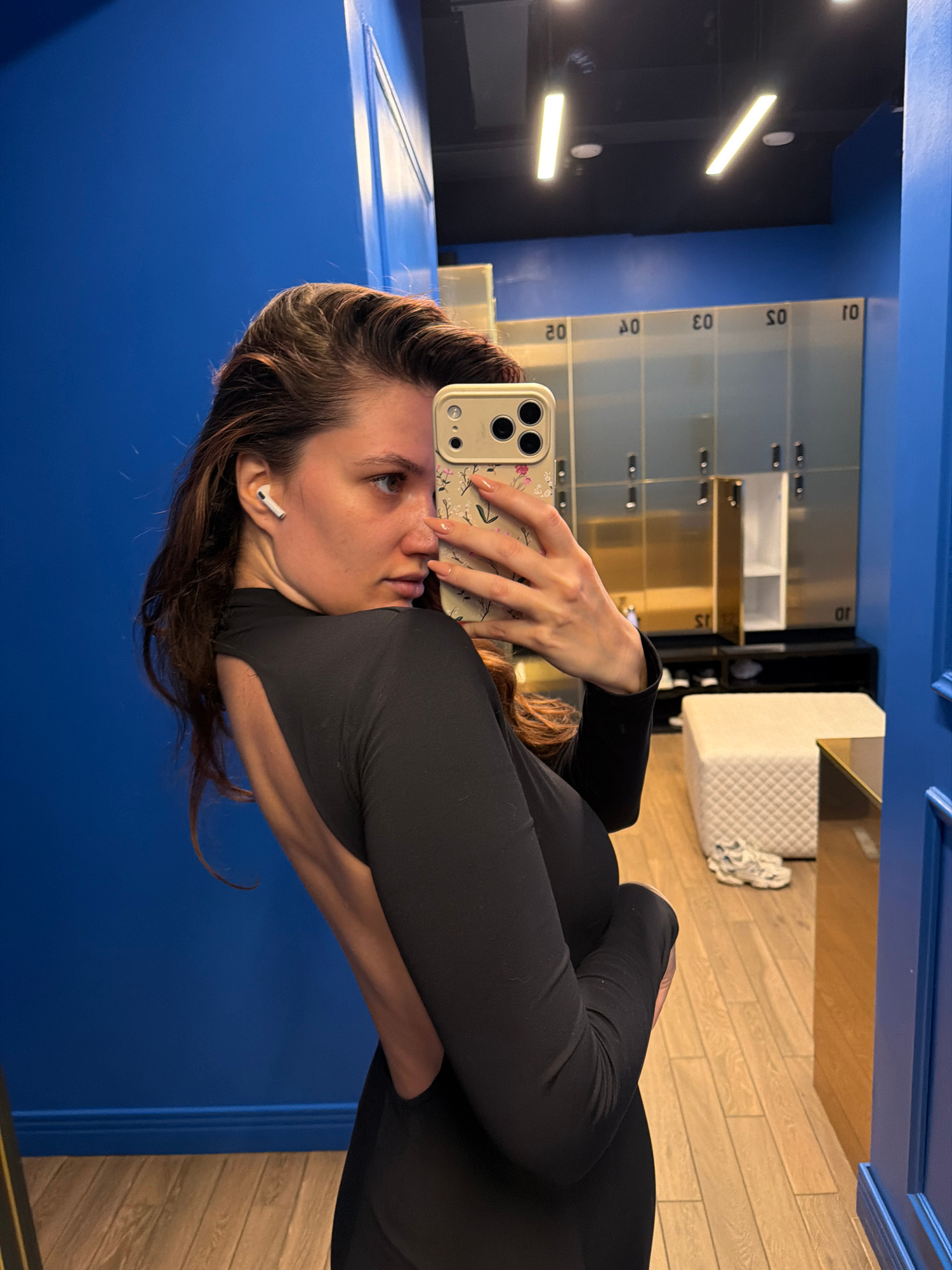 A woman is taking a selfie in a gym locker room. She is wearing a black long-sleeved shirt and black pants. She is holding her phone with a flowered case in her right hand and has an AirPod in her lefβ¦read more