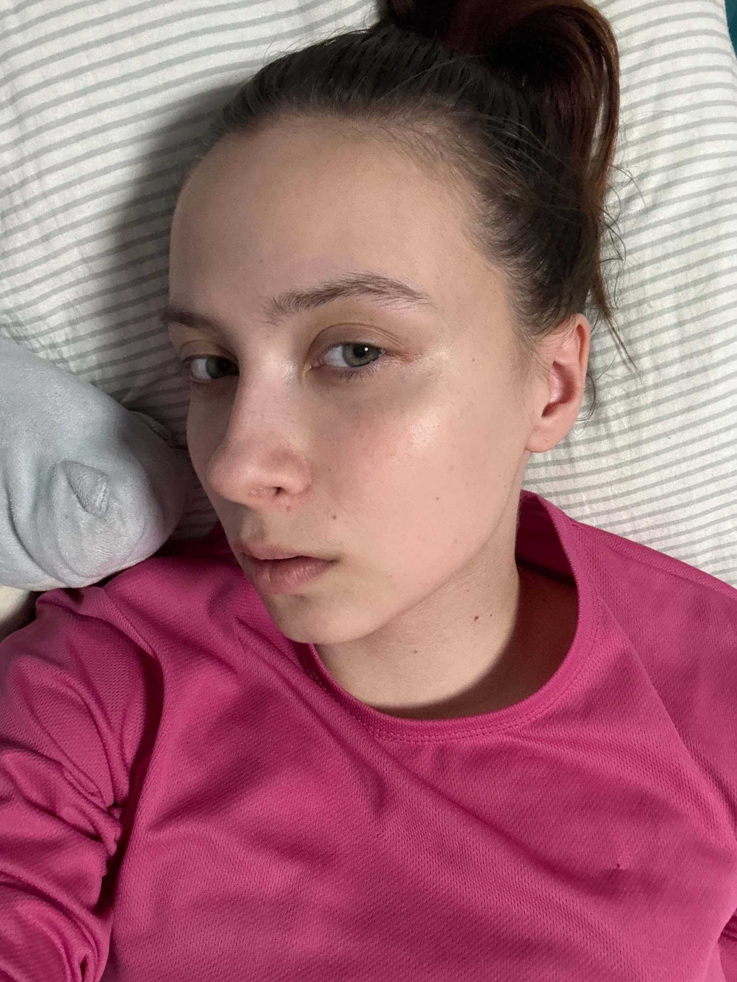 A person lies on a striped pillow. They wear a pink long-sleeved shirt. Their hair is pulled back. A gray sock rests near their face. The location is unknown, there is no evidence of Прикамский, Russi…read more