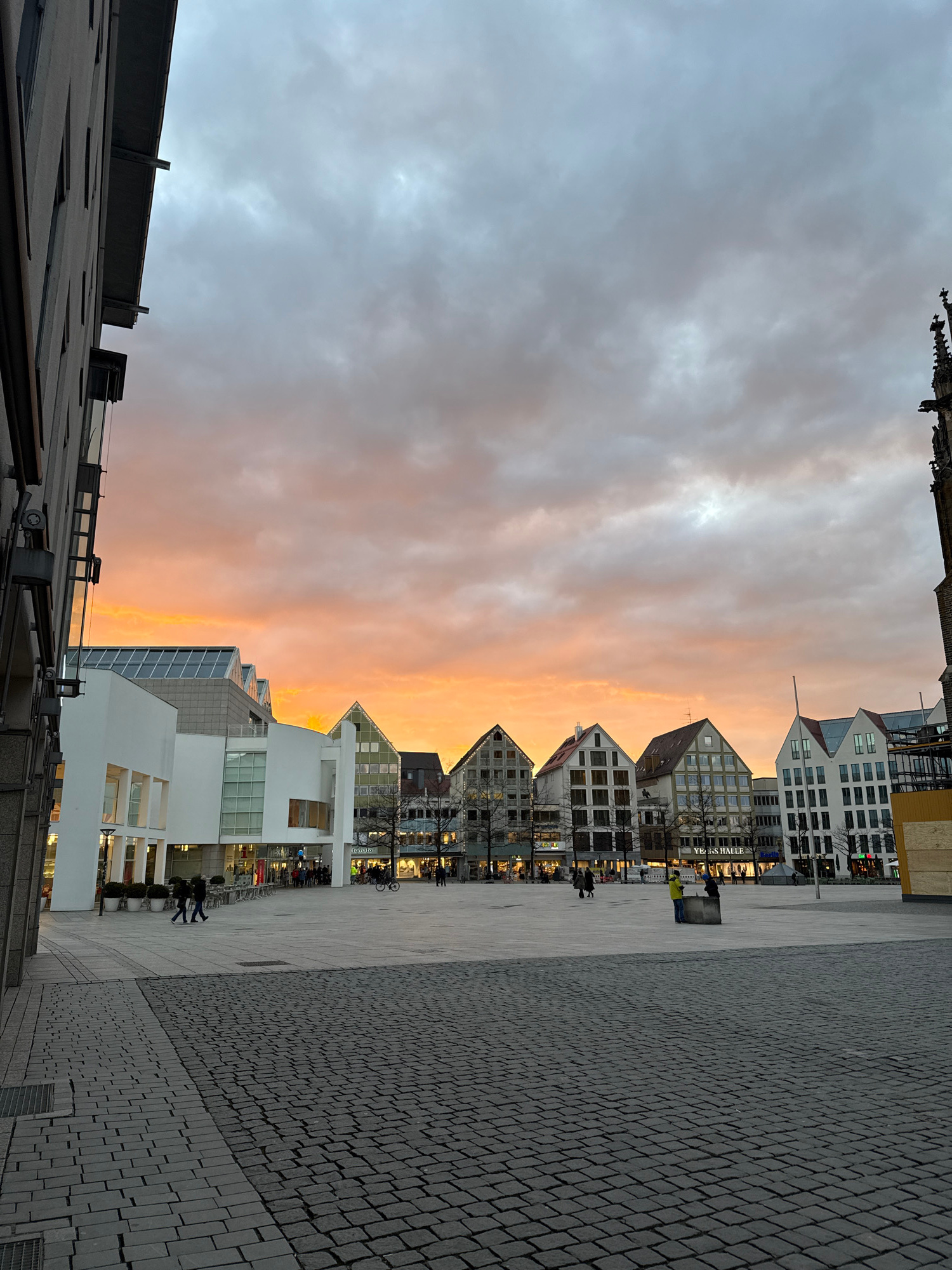The image depicts an urban square at sunset, identified as Münsterplatz in Ulm, Germany, with the Ulm Minster spire partially visible on the far right. The sky occupies the upper two-thirds of the fr…read more