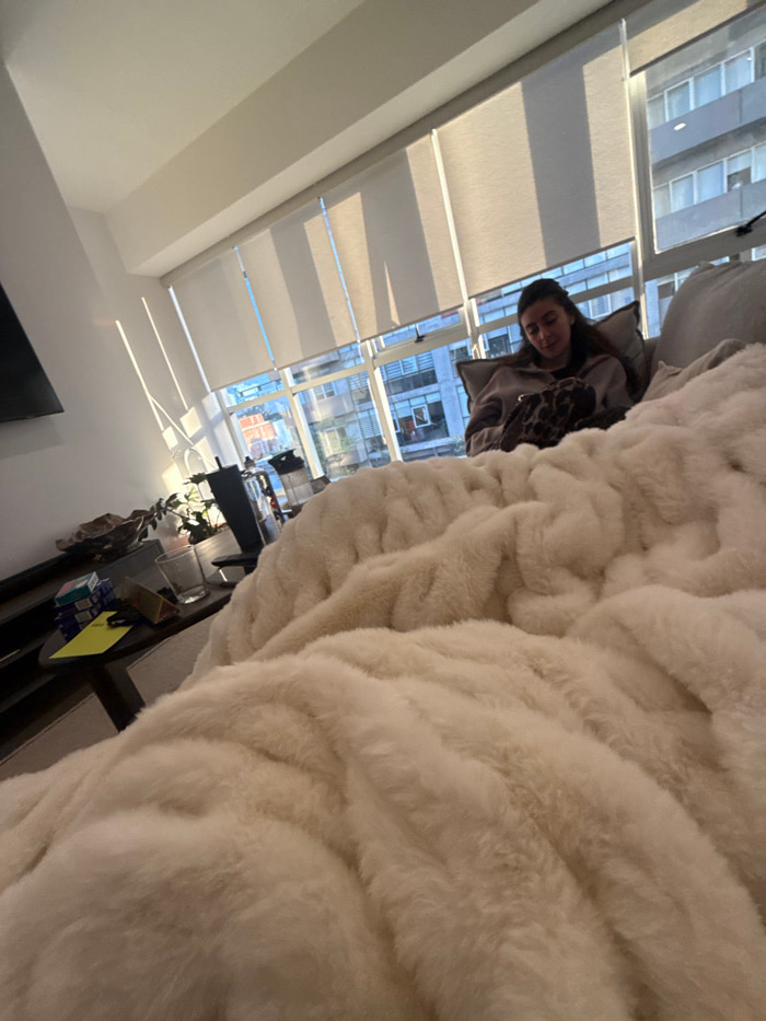A woman lies in bed near a window, partially obscured by a thick, fluffy white blanket. The room features a modern interior with a large window offering a view of buildings across the street. A desk,…read more