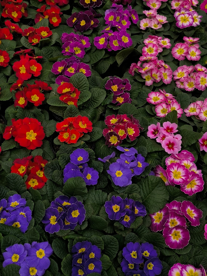 The image displays a dense, top-down view of numerous blooming primrose plants (Primula vulgaris) in a horticultural setting located in Vinnytsia, Ukraine. The plants are tightly arranged, filling the…read more