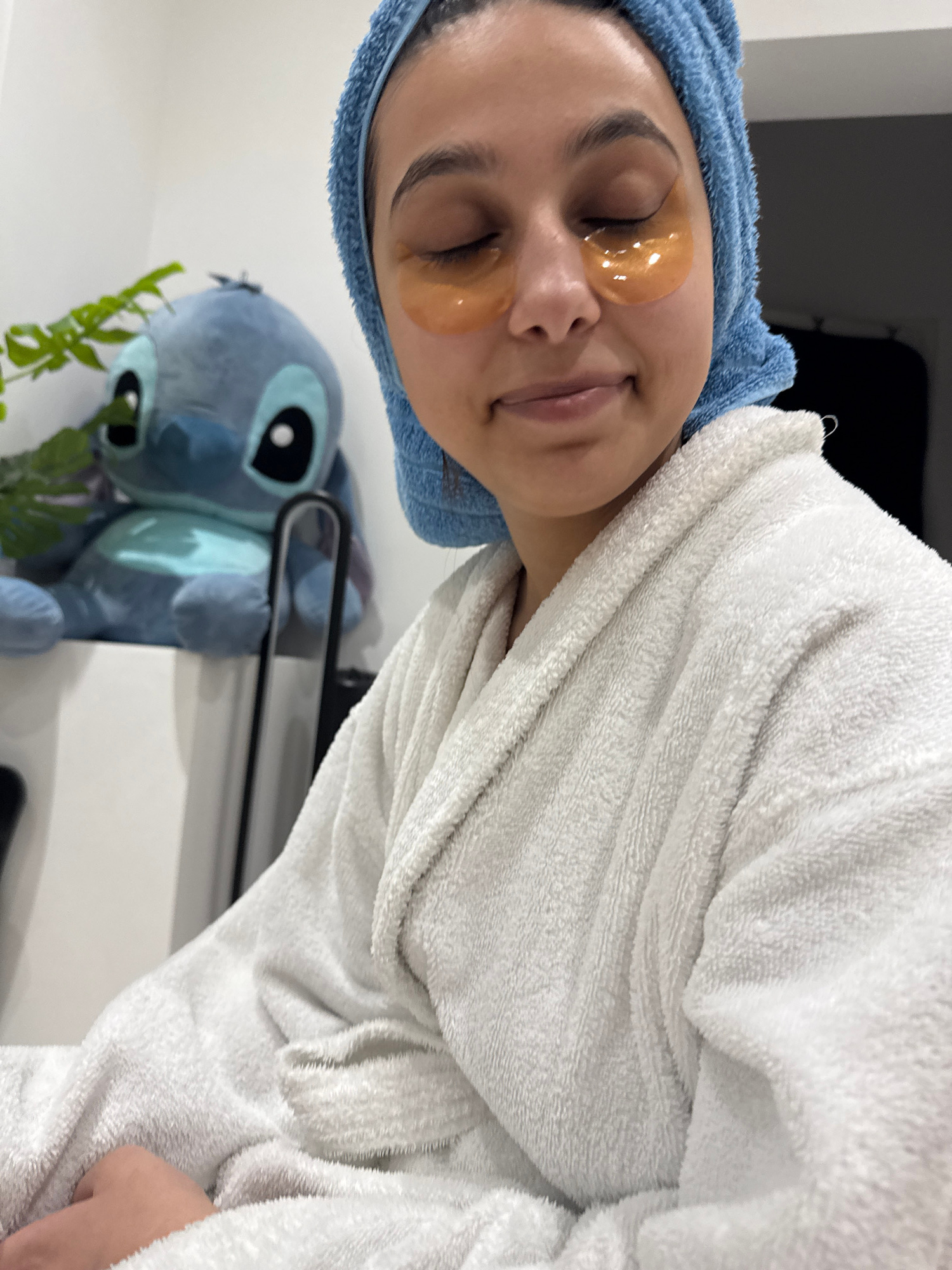 The image displays a close-up, slightly rotated view of a young person, likely female, engaged in a self-care routine within an indoor setting. Her head is tilted, and her eyes are closed, with a soft…read more