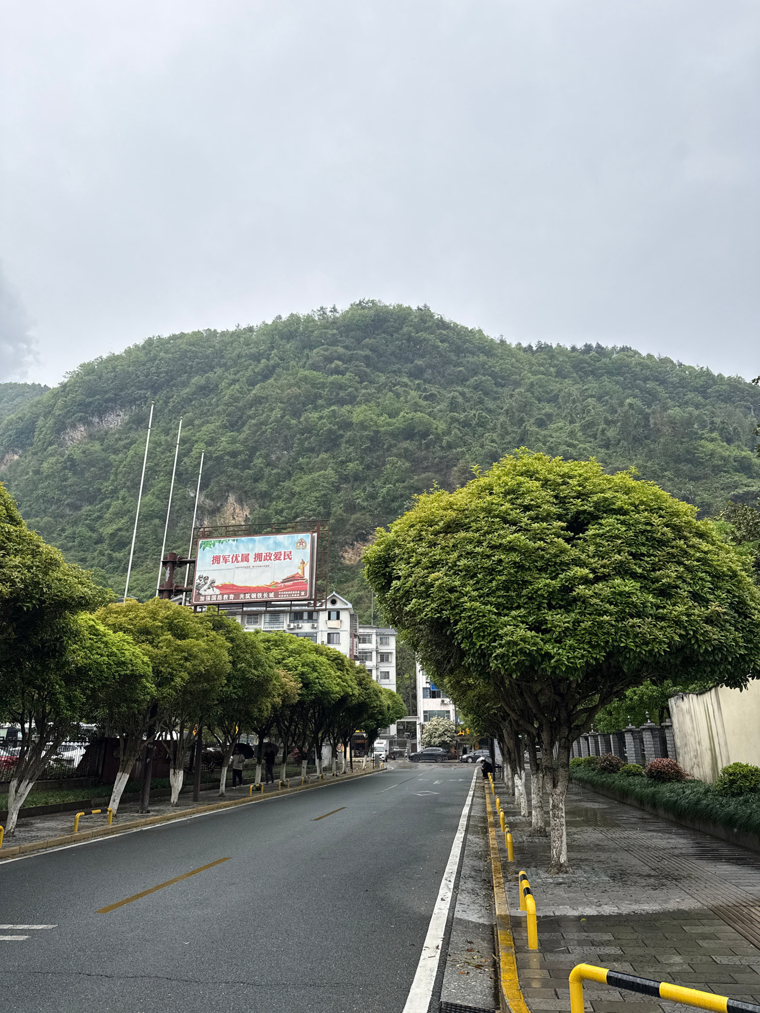 This image captures a street scene set against a backdrop of a lush, mist-shrouded mountain, likely in Wulingyuan, China, given the location context. The dominant feature on the left is a steep mount…read more