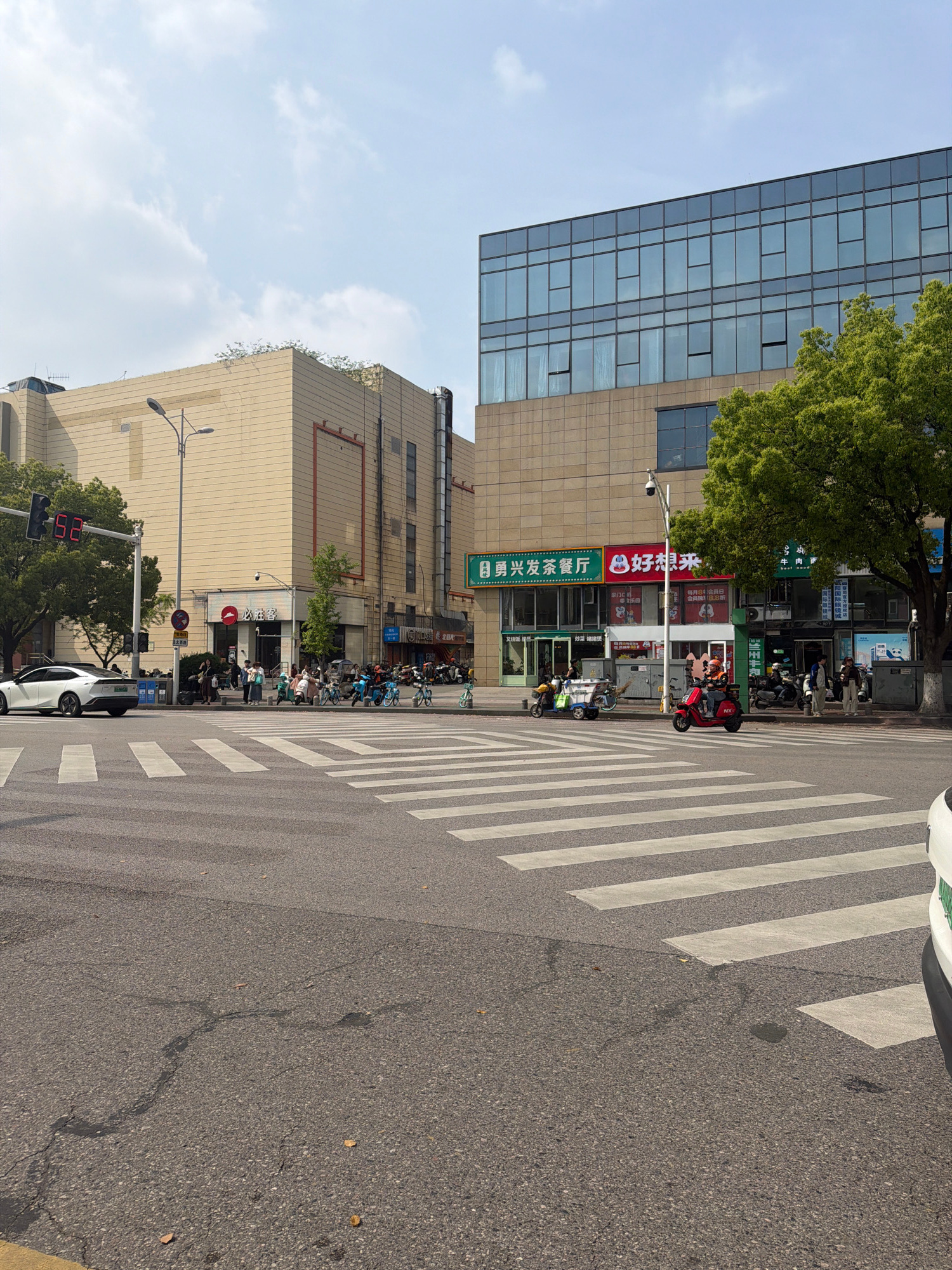 This media file captures a vibrant daytime street scene in Jiangning District, China. The image is oriented vertically but depicts a typical urban intersection with buildings, a road, pedestrian cross…read more