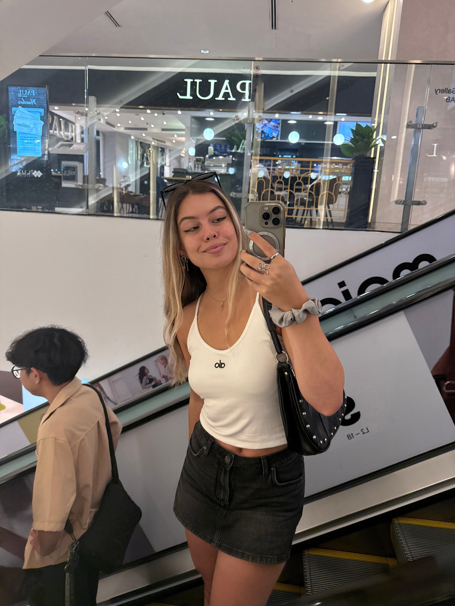 A young woman stands in what appears to be a shopping mall in Thủ Đức, Vietnam, judging by the Paul store sign visible in the background. She is taking a selfie in a reflective surface, possibly a mir…read more