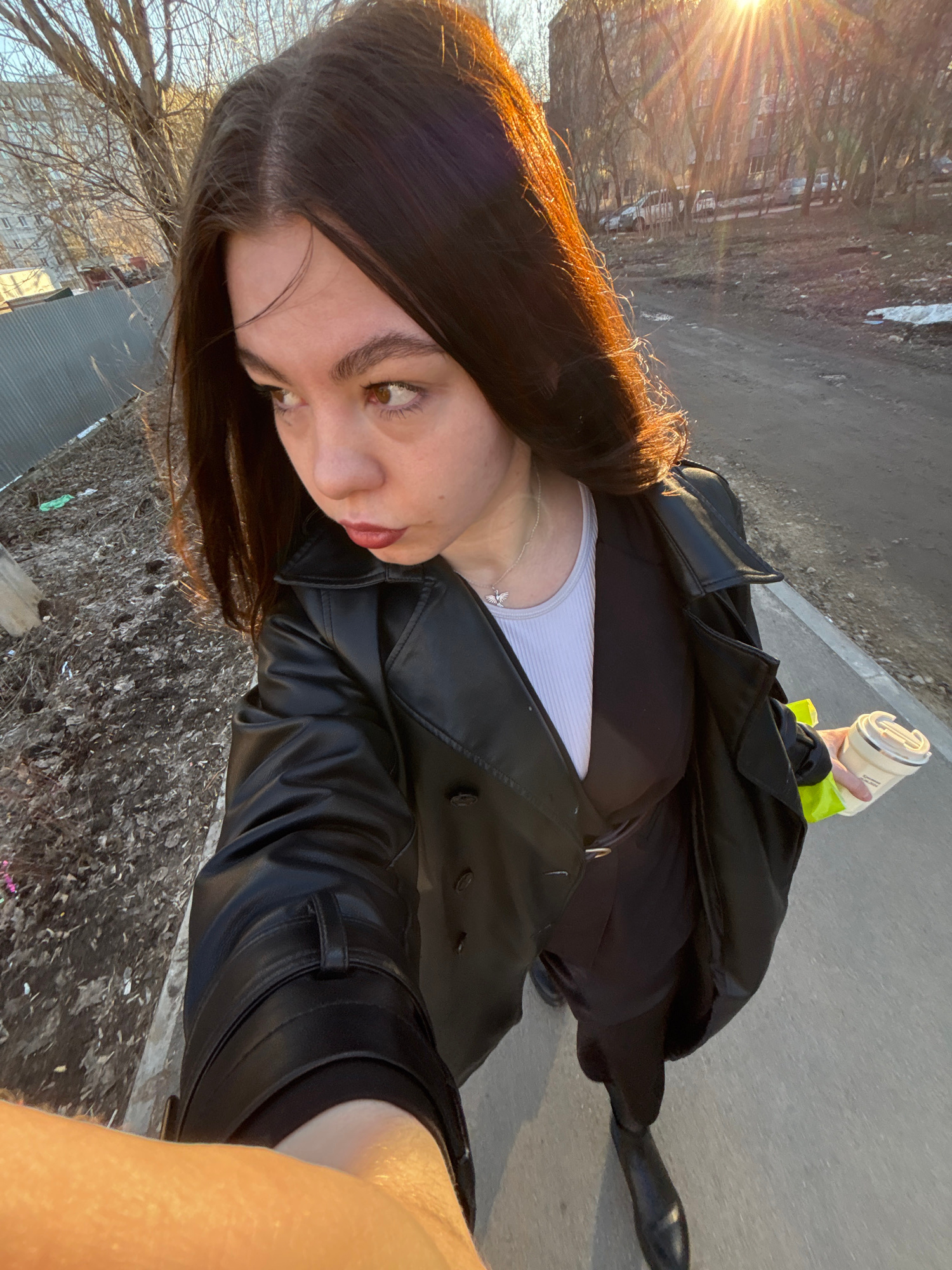 A young woman in a black leather trench coat stands on a sidewalk, holding a beverage in her right hand. She is facing toward the camera with sunlight shining on her dark brown hair. She is wearing a…read more