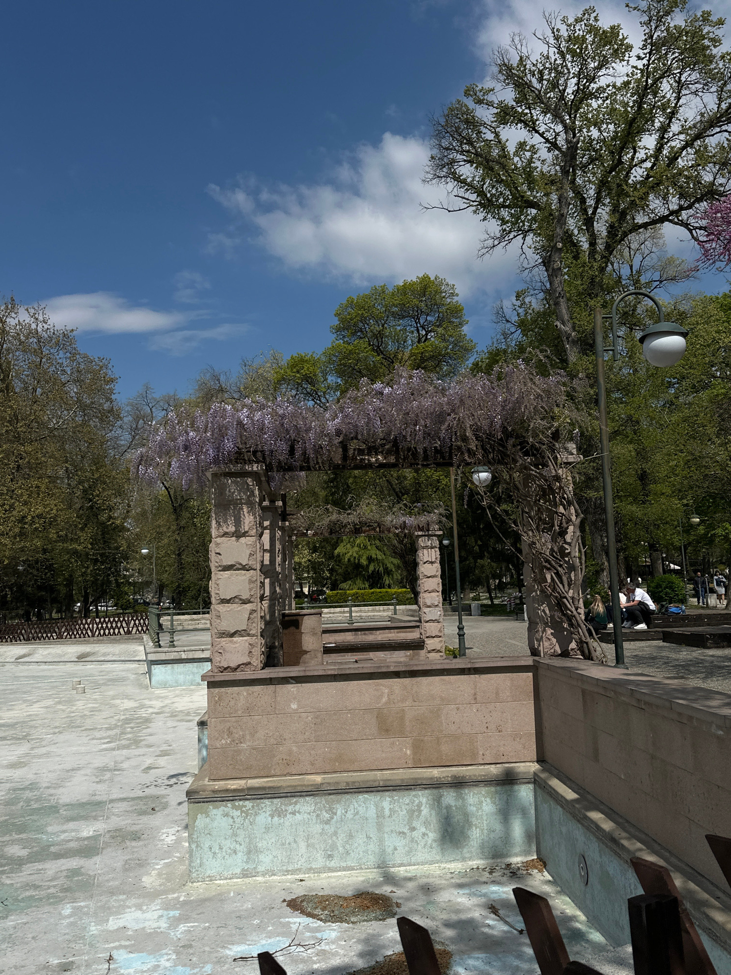 This image captures a serene outdoor scene in a park or public garden, likely in Plovdiv, Bulgaria, on a bright, sunny day. The sky is a clear blue with several fluffy white clouds. The mid-ground is…read more