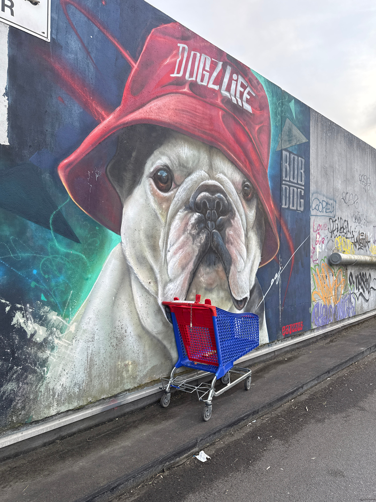A graffiti mural of a bulldog wearing a red hoodie with the words "DOGZ LIFE" written on it is painted on a concrete wall, as viewed from an above angle. Atop the mural, near the right eye of the dog,…read more