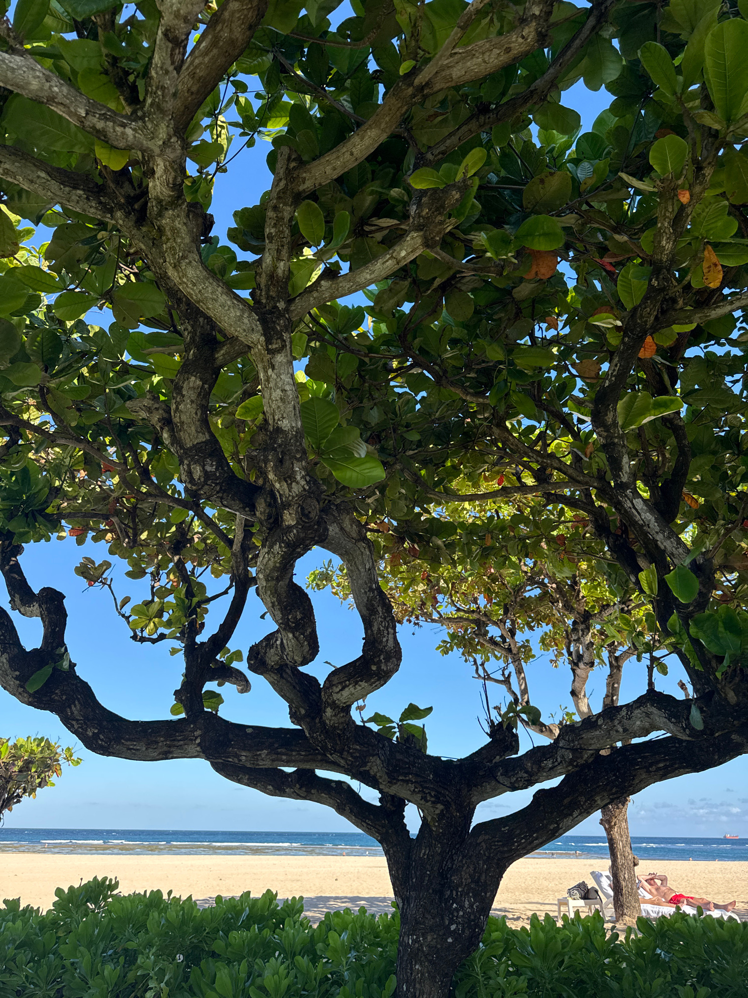 View of a beach in Kuta Selatan, Indonesia, through the branches and leaves of a tree. A sandy beach and ocean are visible in the background, and a person is lying on a beach chair.