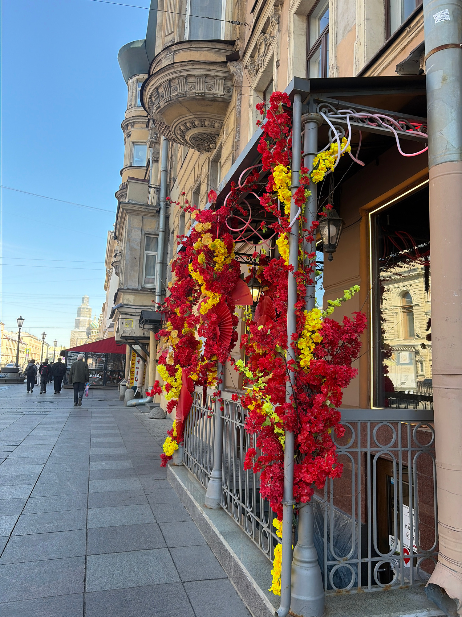 This image depicts a vibrant street scene in Saint Petersburg, Russia, under a clear blue sky. The perspective looks down a pedestrian walkway, flanked by buildings on both sides. The most prominent…read more