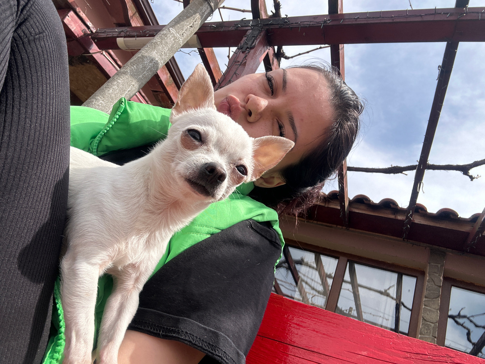A woman is holding a small, light-colored dog. She is wearing a green jacket with a black shirt underneath. The dog is resting against her. The background includes a red-painted structure, possibly a…read more