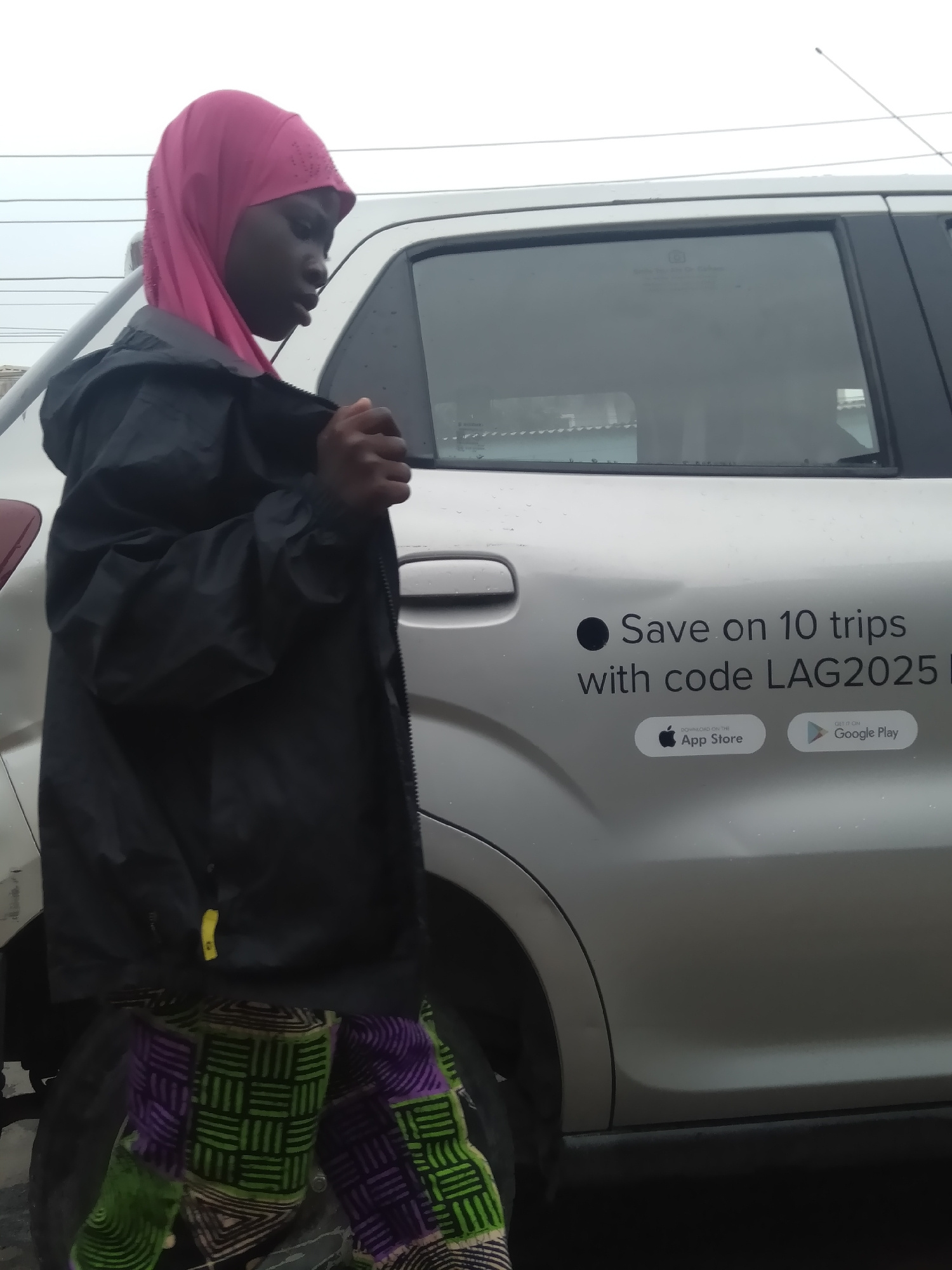 A photograph shows a person in the foreground wearing a pink headscarf, a black jacket, and colorful patterned pants standing next to a silver car. The car advertises "Save on 10 trips with code LAG20…read more