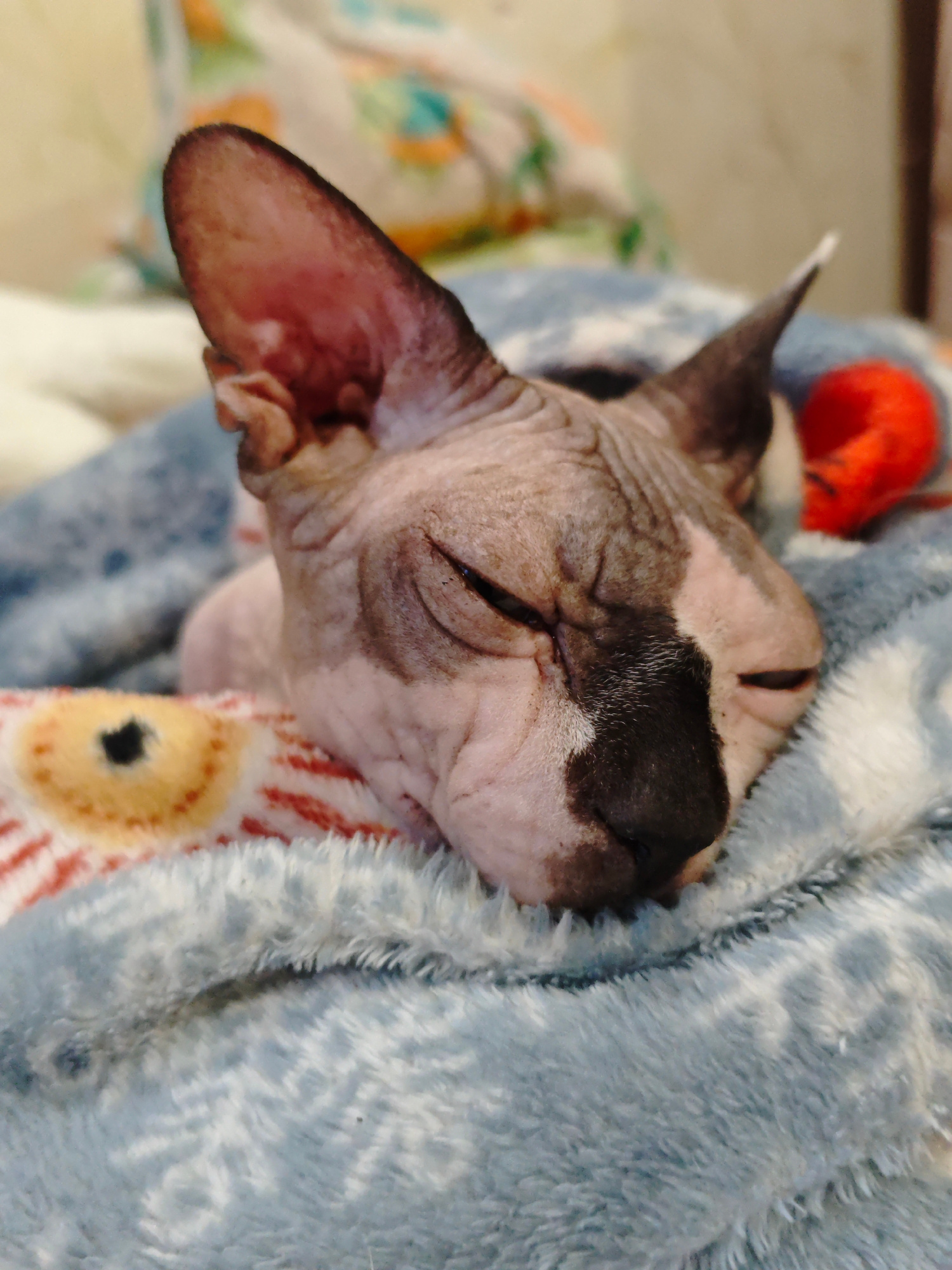 A hairless Sphynx cat is deeply asleep, nestled in a soft, light blue blanket with a pattern of white stars. The cat's skin is a pale pinkish-gray with dark patches on its nose and around its eyes. It…read more