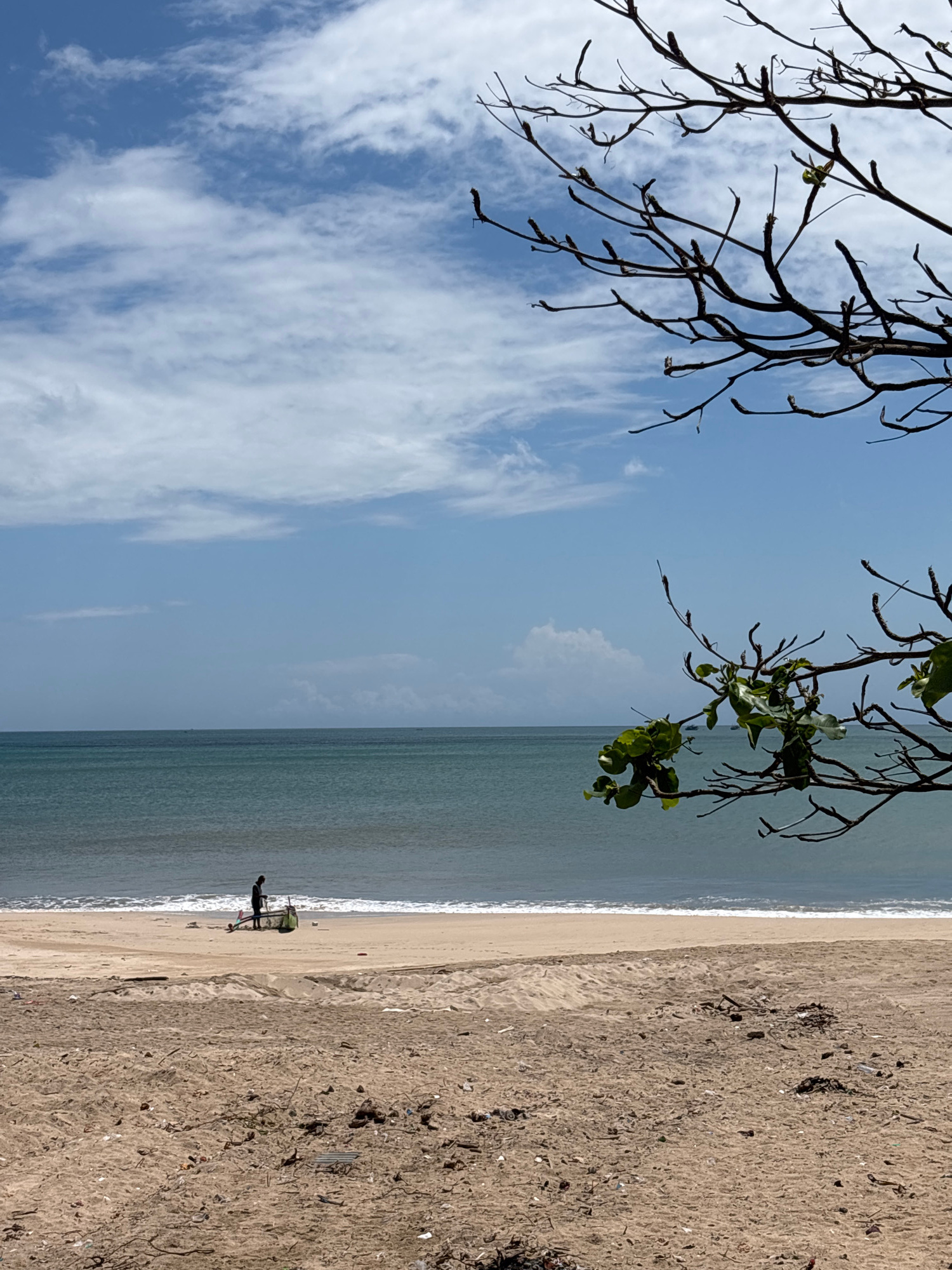 The scene is a beach in Kuta, Indonesia. The sky is partly cloudy. The ocean is calm. A person is standing near the shoreline, possibly using a cart or some equipment. The beach is sandy and has some…read more