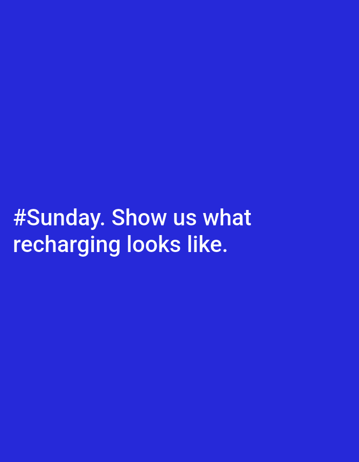 The image is a solid blue background with white text at the bottom left that reads "#Sunday. Show us what recharging looks like." There is no indication of a location in Chaikovsky, Russia or any otheβ¦read more