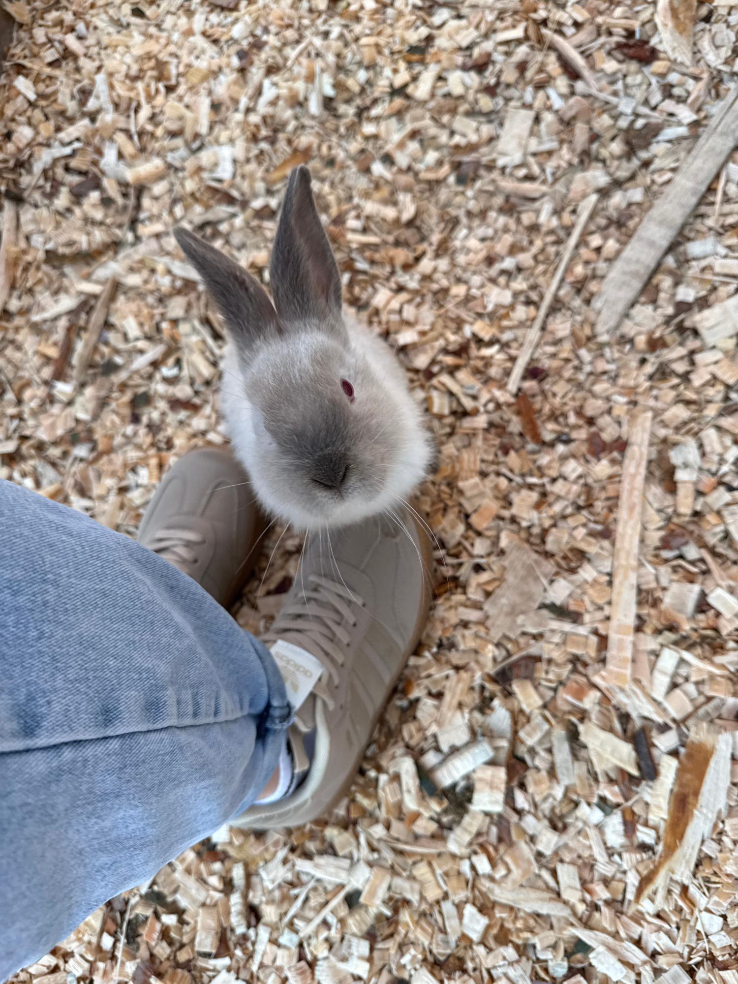 The image shows a low-angle view of a light-colored bunny standing on wood chips next to a person's leg. The bunny has grayish-brown fur, long ears, and red eyes. The person is wearing light blue jean…read more